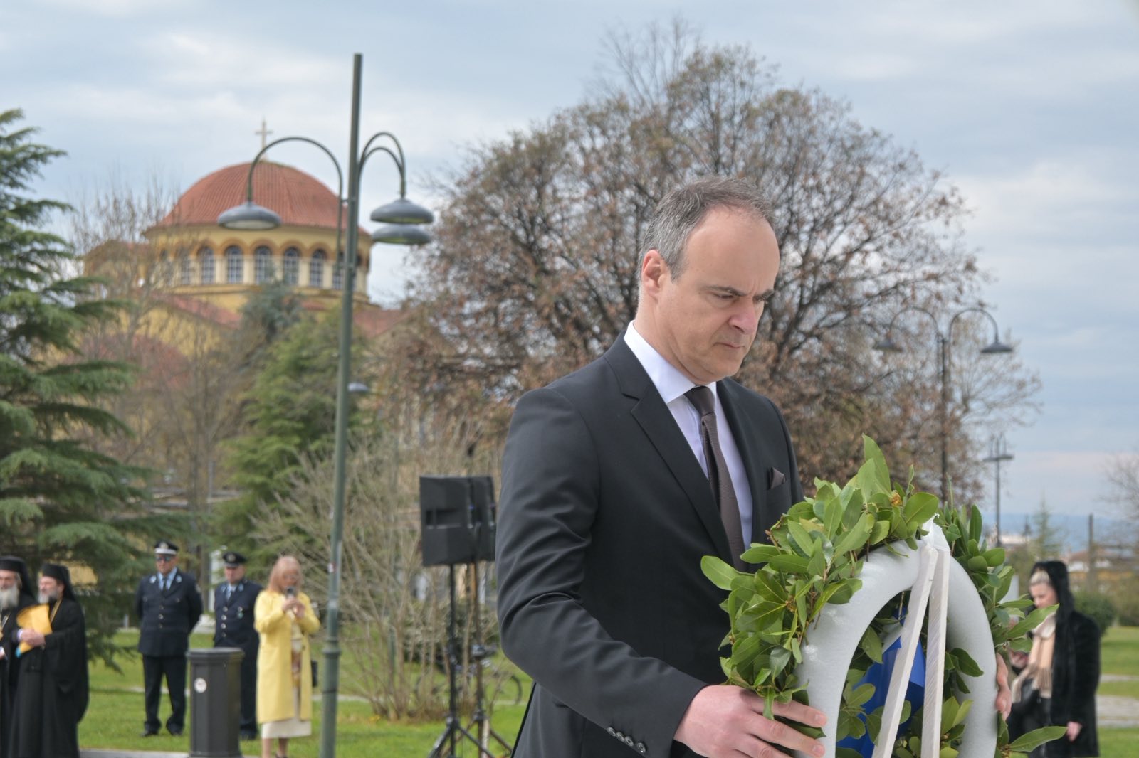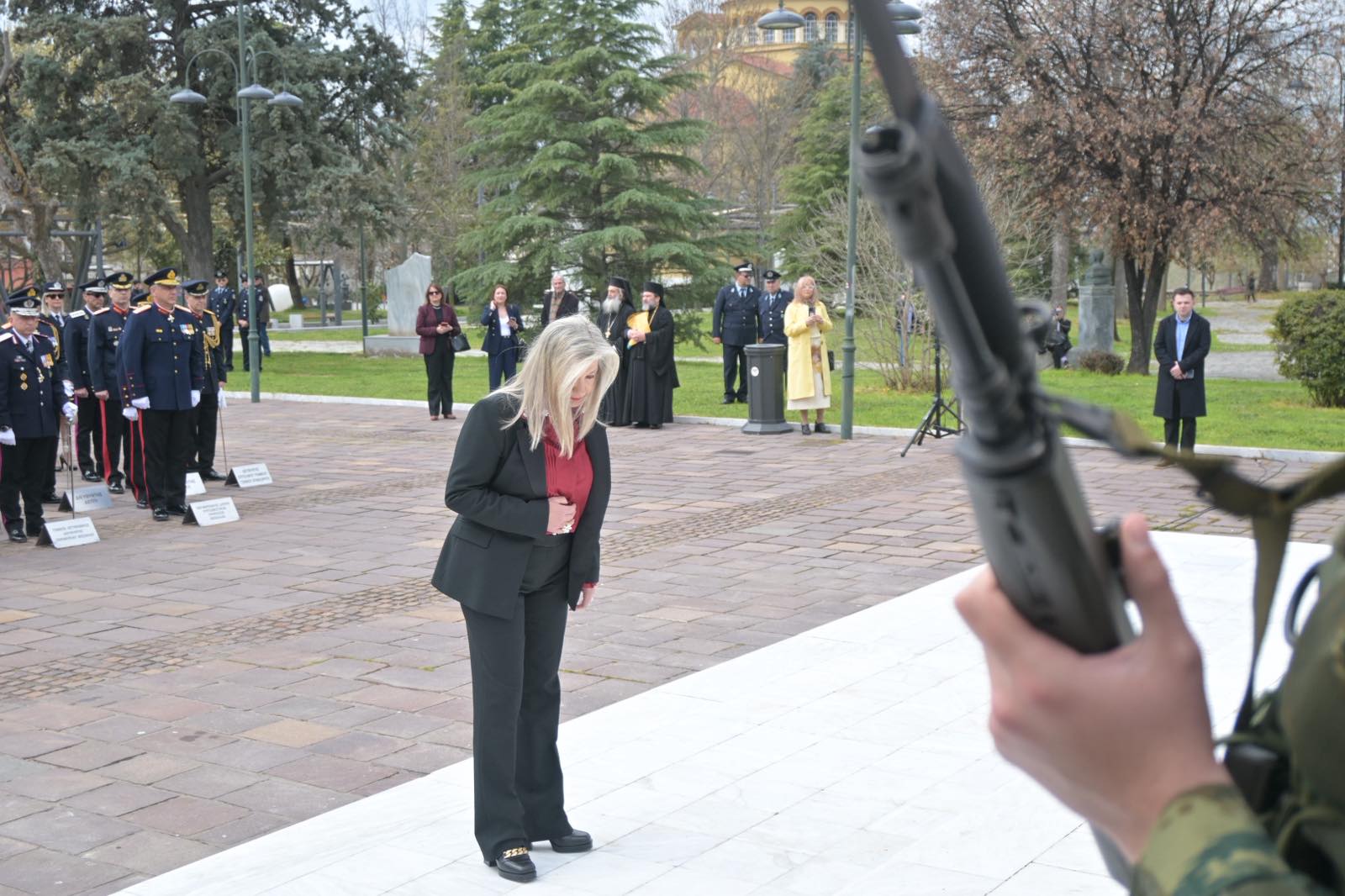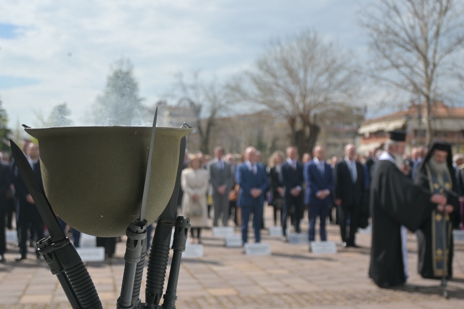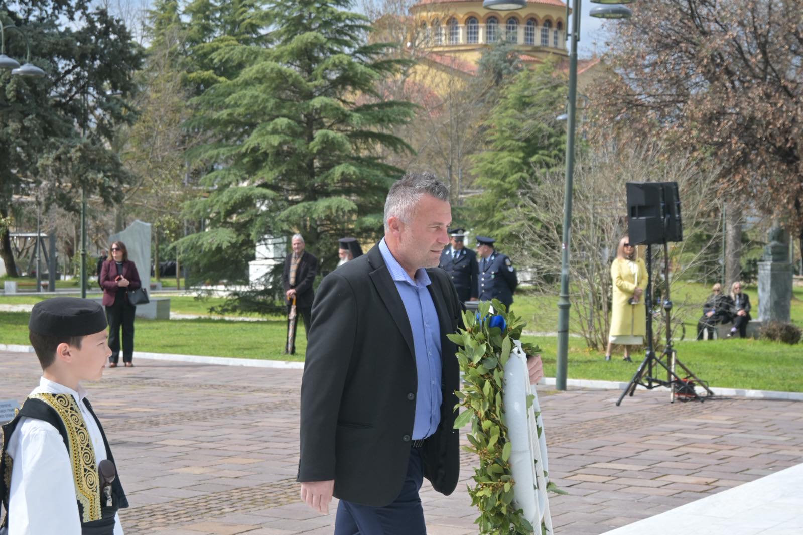 Αμέσως μετά την πανηγυρική δοξολογία που εψάλη στον Ιερό Ναό του Αγίου Αχιλλίου, πολιτικοί και στρατιωτικοί φορείς βρέθηκαν στο Ηρώο Πεσόντων.