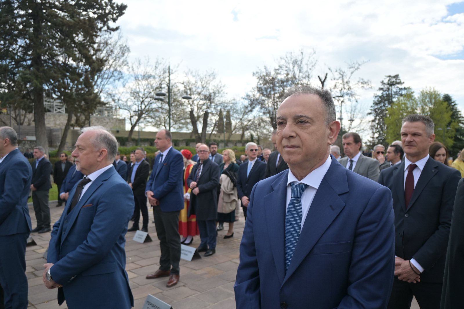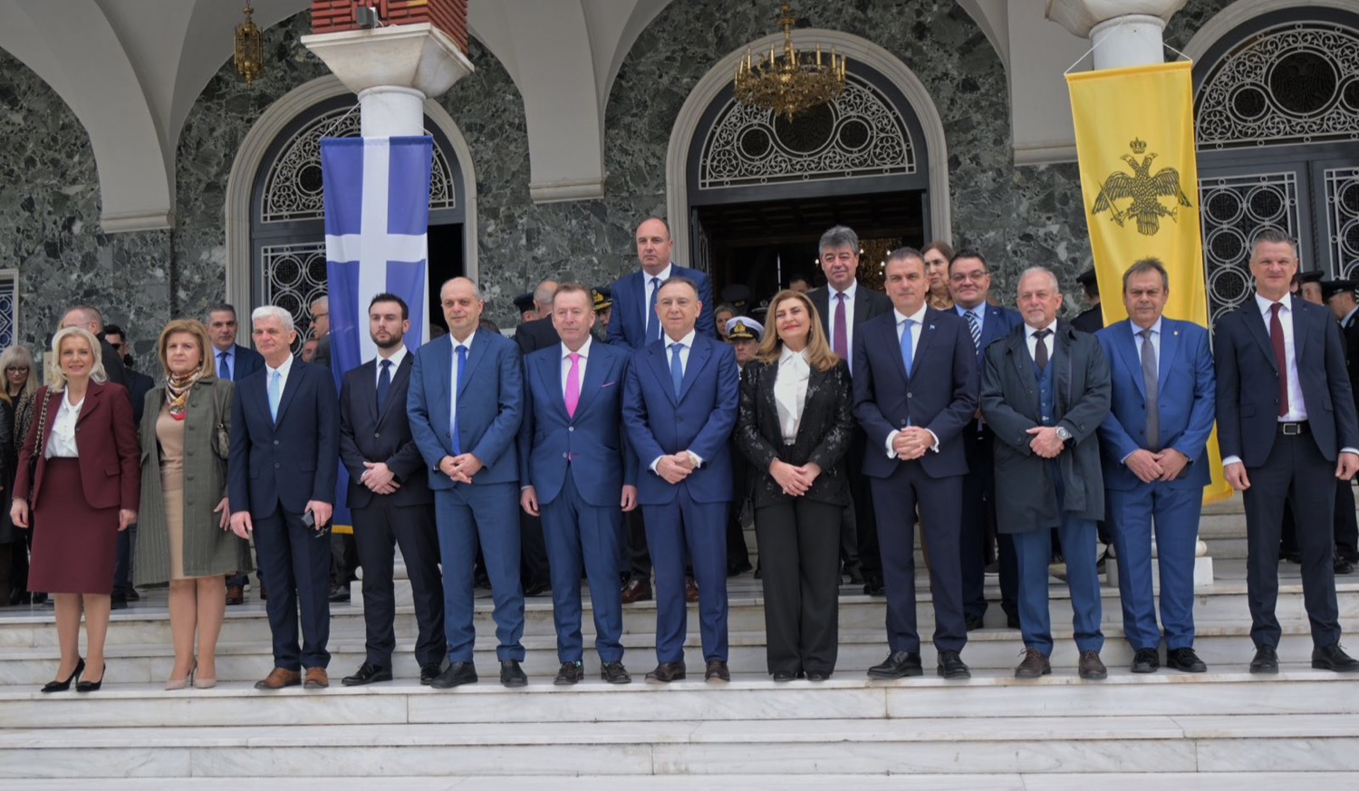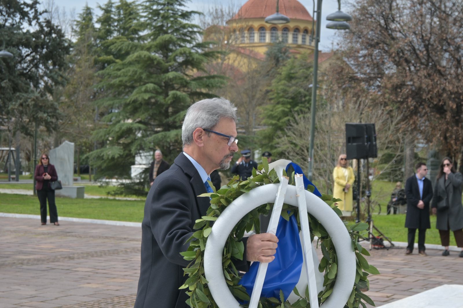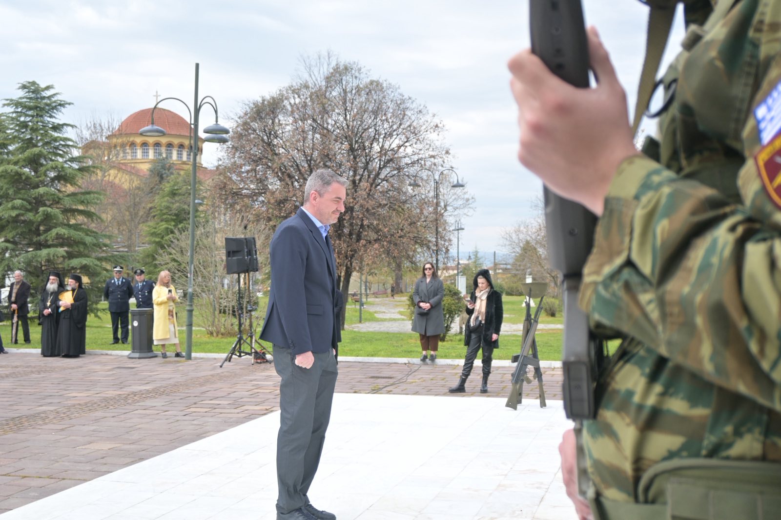 Αμέσως μετά την πανηγυρική δοξολογία που εψάλη στον Ιερό Ναό του Αγίου Αχιλλίου, πολιτικοί και στρατιωτικοί φορείς βρέθηκαν στο Ηρώο Πεσόντων.