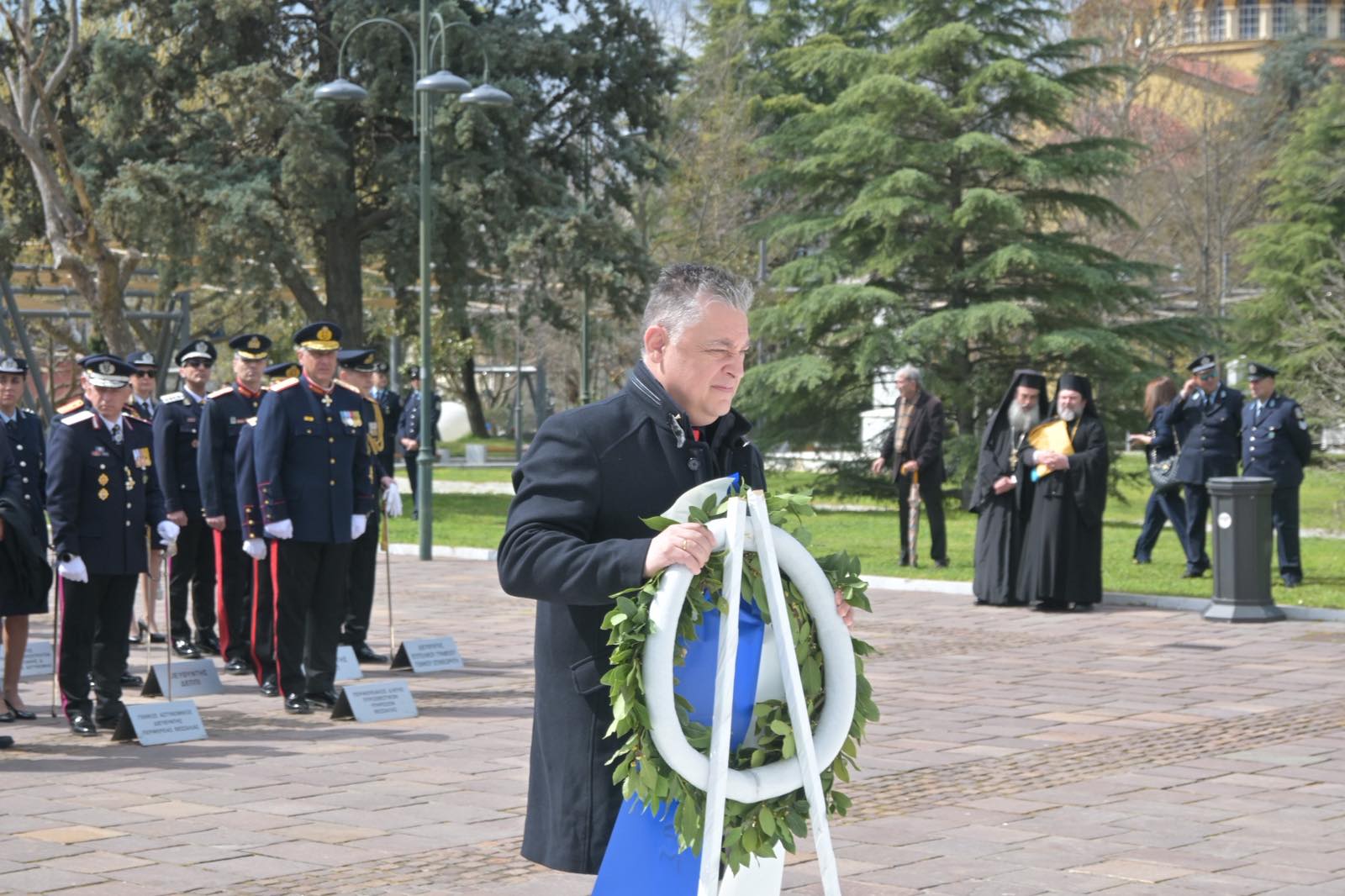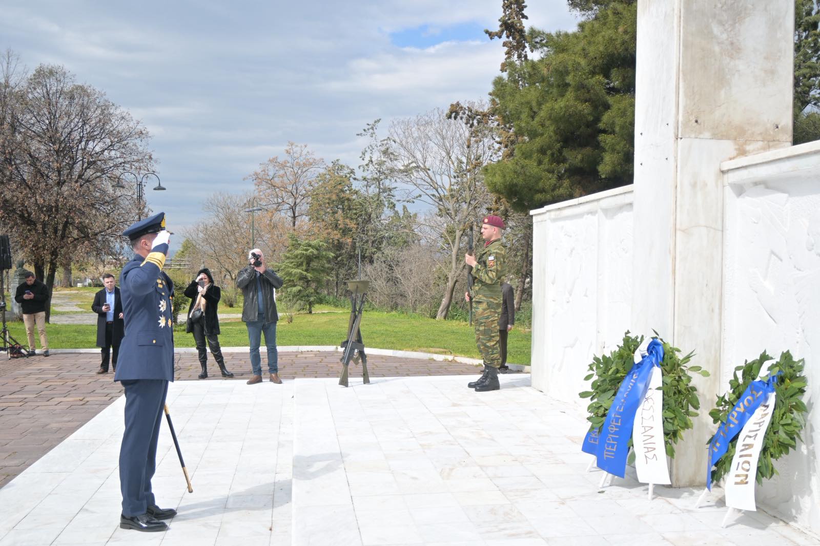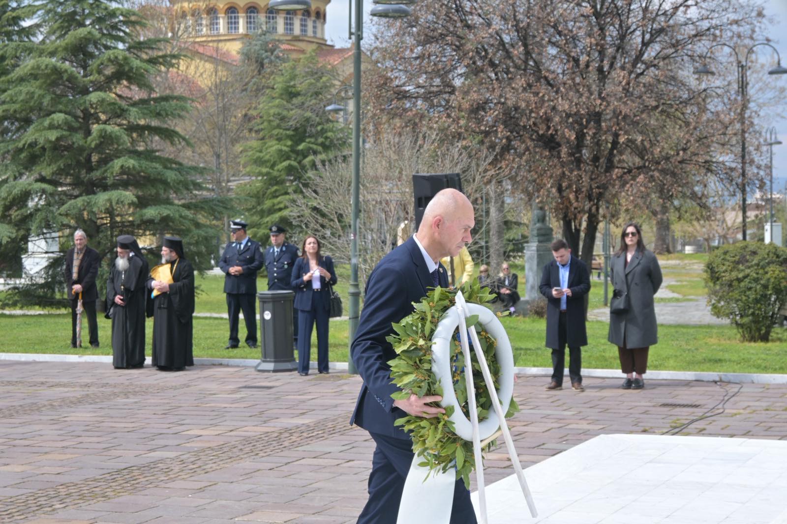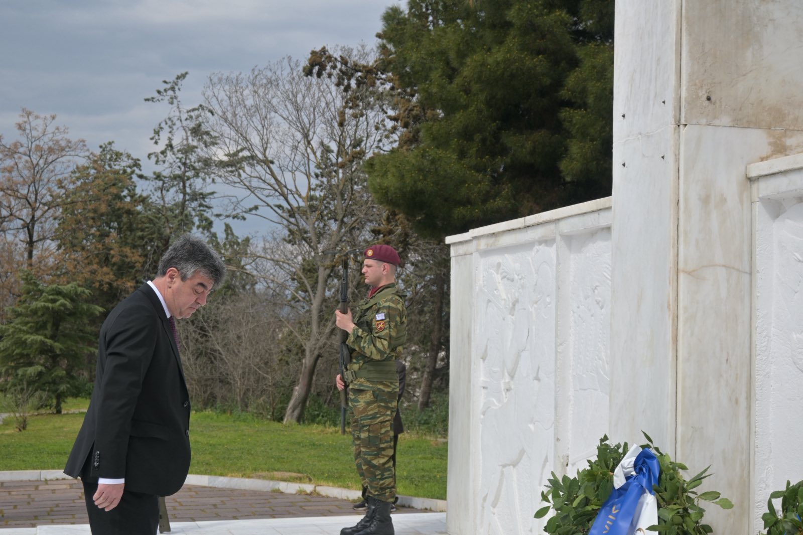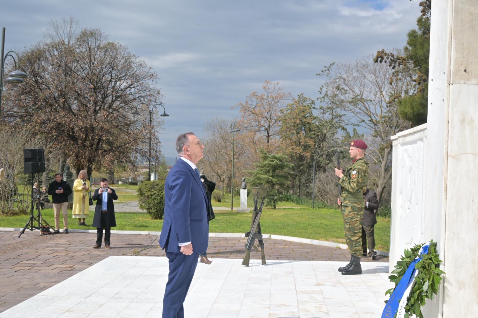 Εκεί, σε μία γεμάτη σεβασμό σεμνή τελετή, κατέθεσαν στεφάνια εις τη μνήμη όσων έπεσαν μαχόμενοι για την ανεξαρτησία της πατρίδας, ανήμερα της εθνικής επετείου της 25ης Μαρτίου.