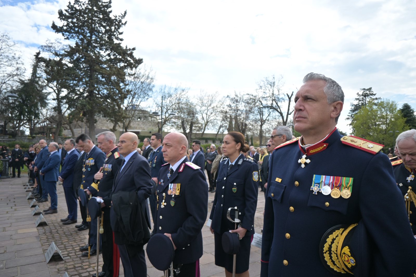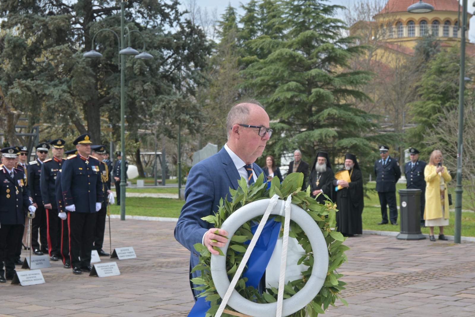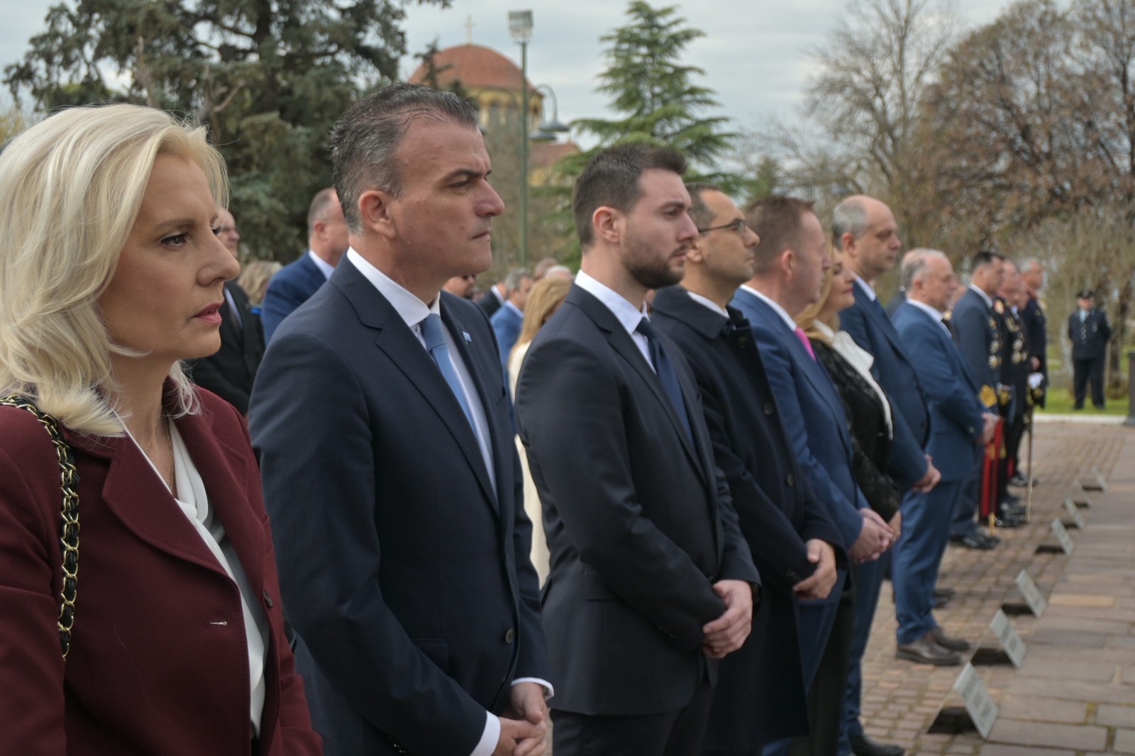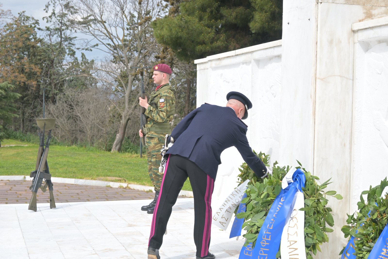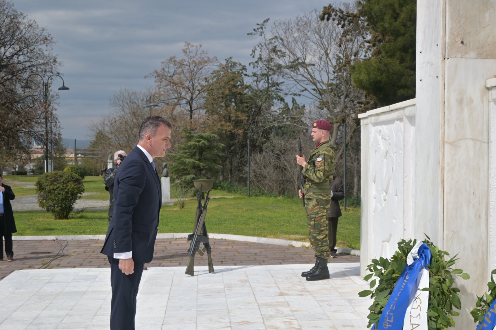 Εκεί, σε μία γεμάτη σεβασμό σεμνή τελετή, κατέθεσαν στεφάνια εις τη μνήμη όσων έπεσαν μαχόμενοι για την ανεξαρτησία της πατρίδας, ανήμερα της εθνικής επετείου της 25ης Μαρτίου.
