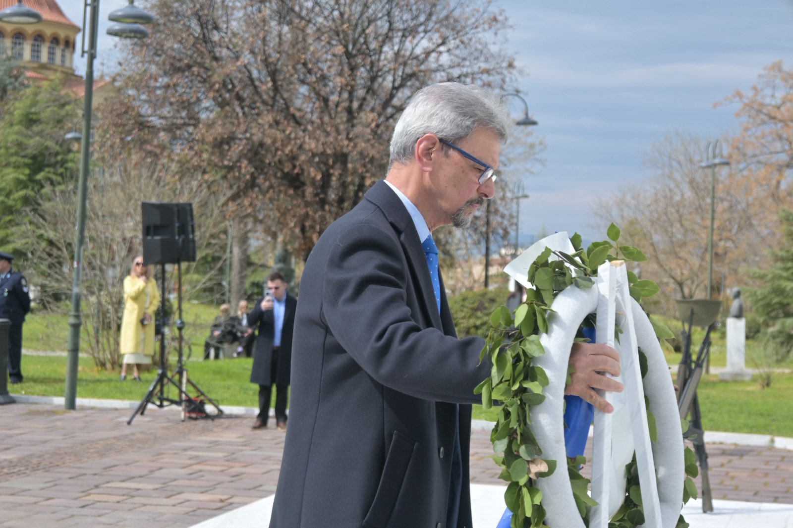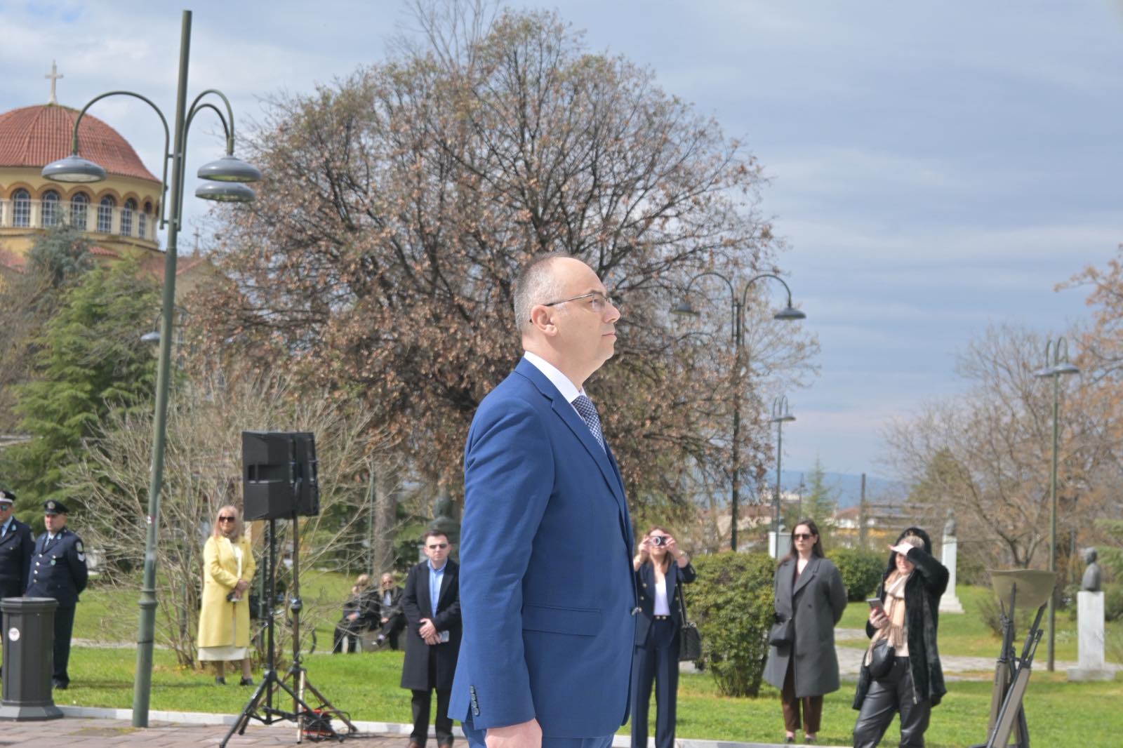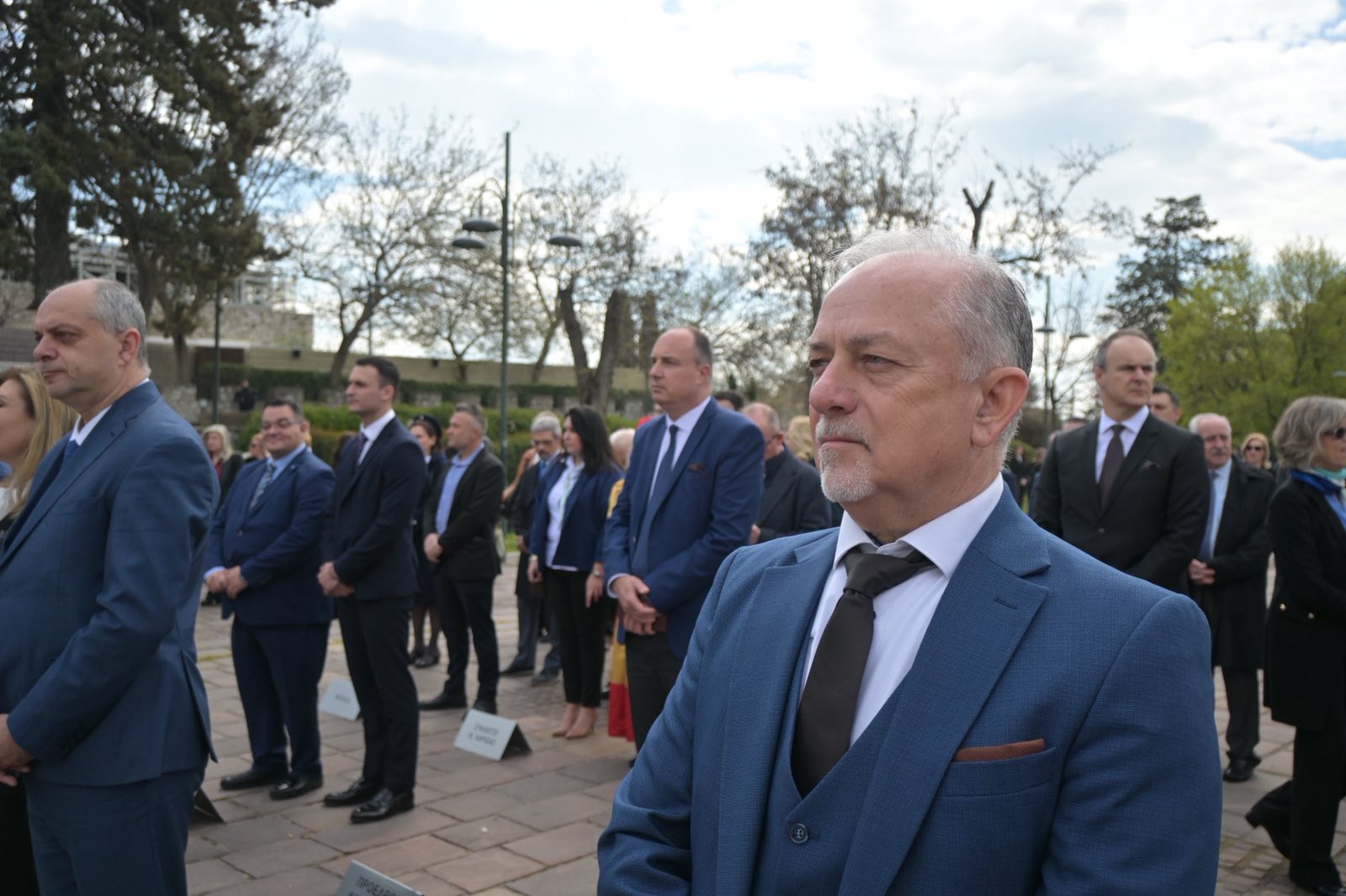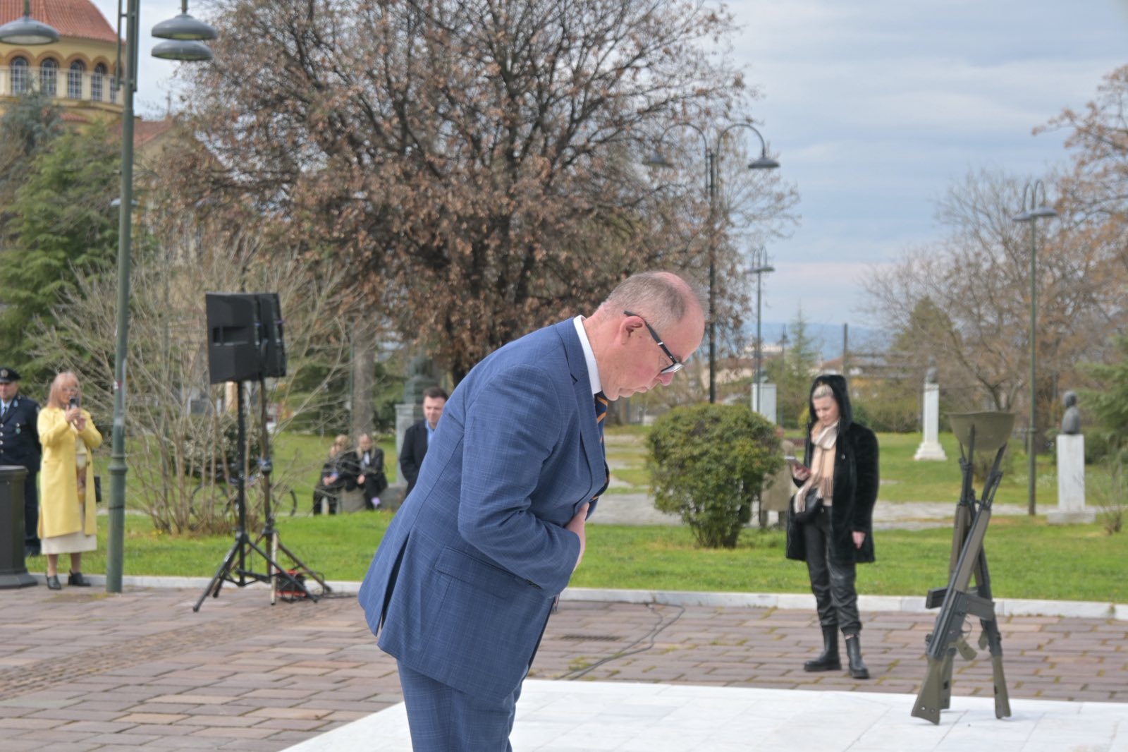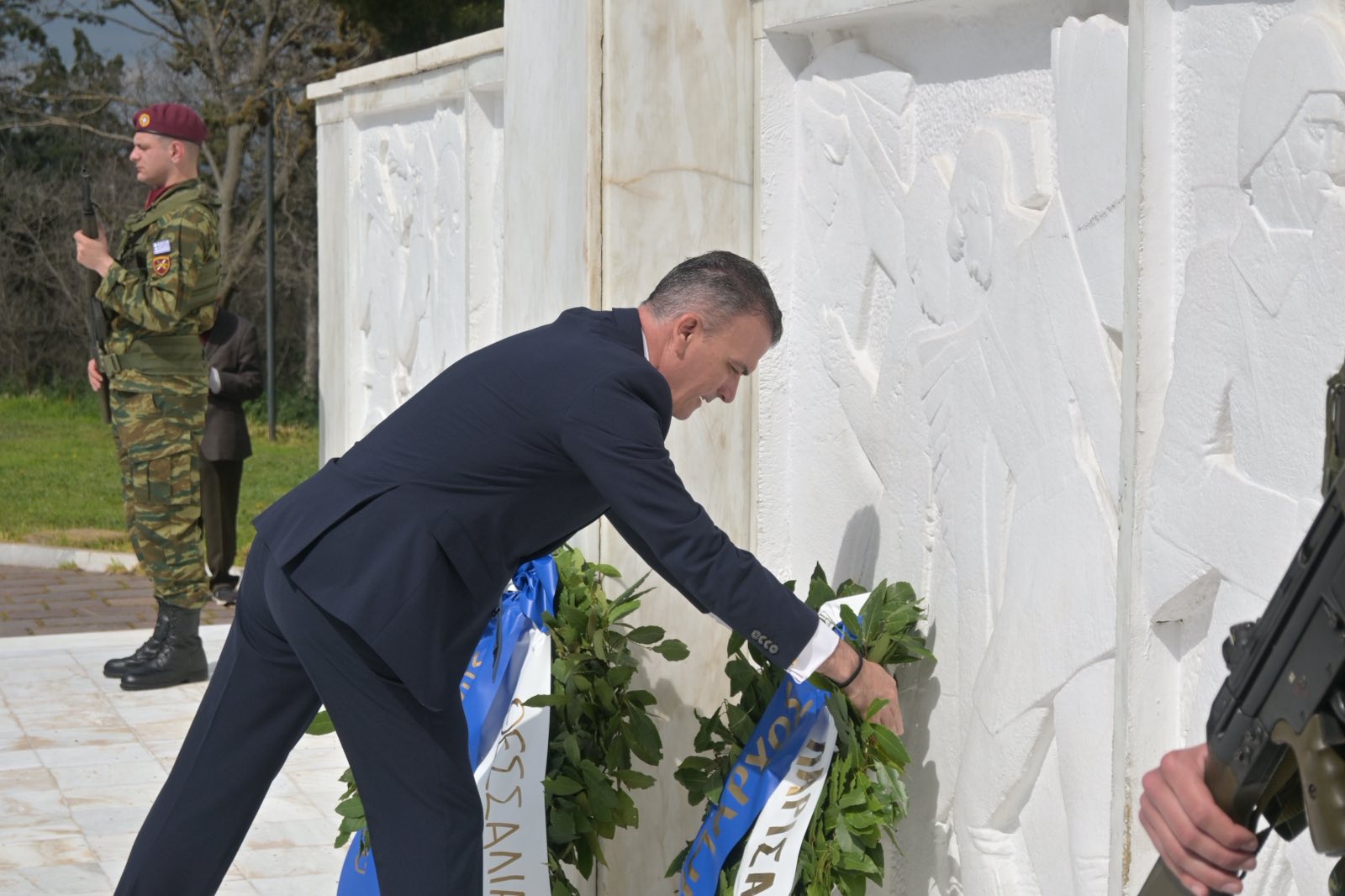 Εκεί, σε μία γεμάτη σεβασμό σεμνή τελετή, κατέθεσαν στεφάνια εις τη μνήμη όσων έπεσαν μαχόμενοι για την ανεξαρτησία της πατρίδας, ανήμερα της εθνικής επετείου της 25ης Μαρτίου.
