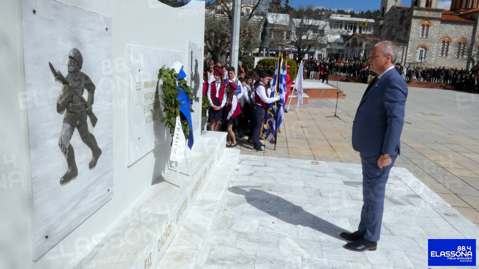 Μετά το πέρας της δοξολογίας, οι επίσημοι προσκεκλημένοι και πλήθος κόσμου μετέβησαν στον χώρο του Μνημείου των Πεσόντων στην κεντρική πλατεία της πόλης. Εκεί τελέστηκε επιμνημόσυνη δέηση προς τιμήν των ηρώων, ενώ τον πανηγυρικό της ημέρας εκφώνησε η διευθύντρια του 1ου Λυκείου Ελασσόνας και Δρ. Κοινωνικής Λαογραφίας του Πανεπιστημίου Αιγαίου, κ. Ευαγγελία Ράπτου-Στεργιούλα.