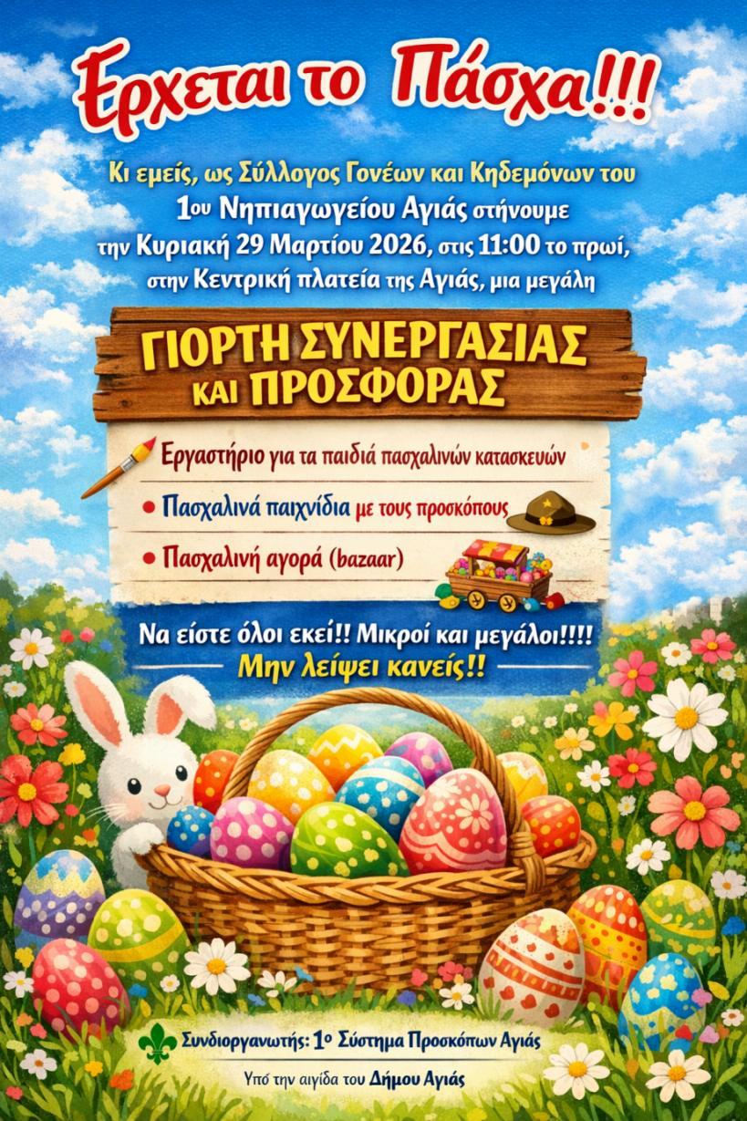 Το 1ο Σύστημα Προσκόπων Αγιάς συμμετέχει μαζί με τον Σύλλογο Γονέων και Κηδεμόνων του 1ου Νηπιαγωγείου Αγιάς σε μια μεγάλη γιορτή για όλα τα παιδιά, με πολλά παιχνίδια και κατασκευές, την Κυριακή 29 Μαρτίου και ώρα 11 π.μ στην Κεντρική Πλατεία Αγιάς.
