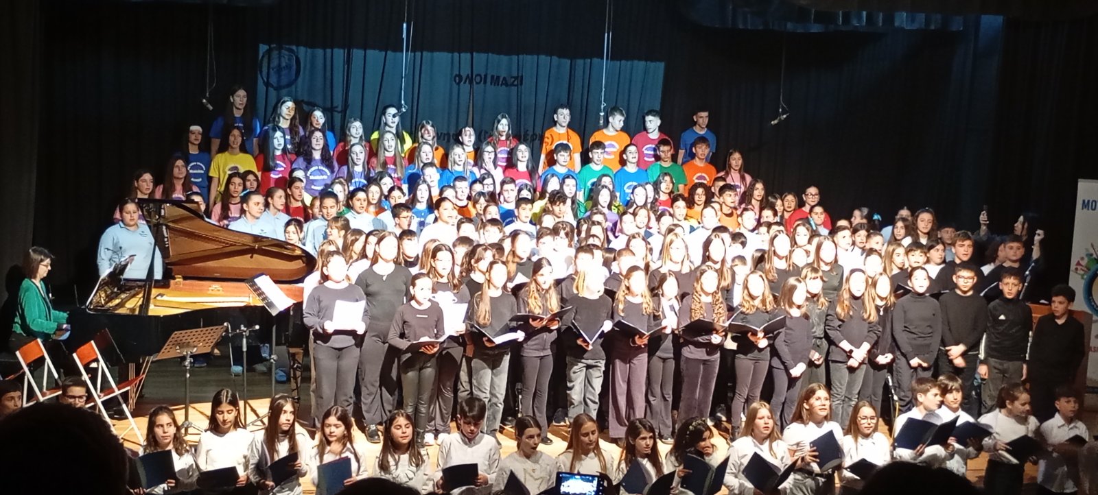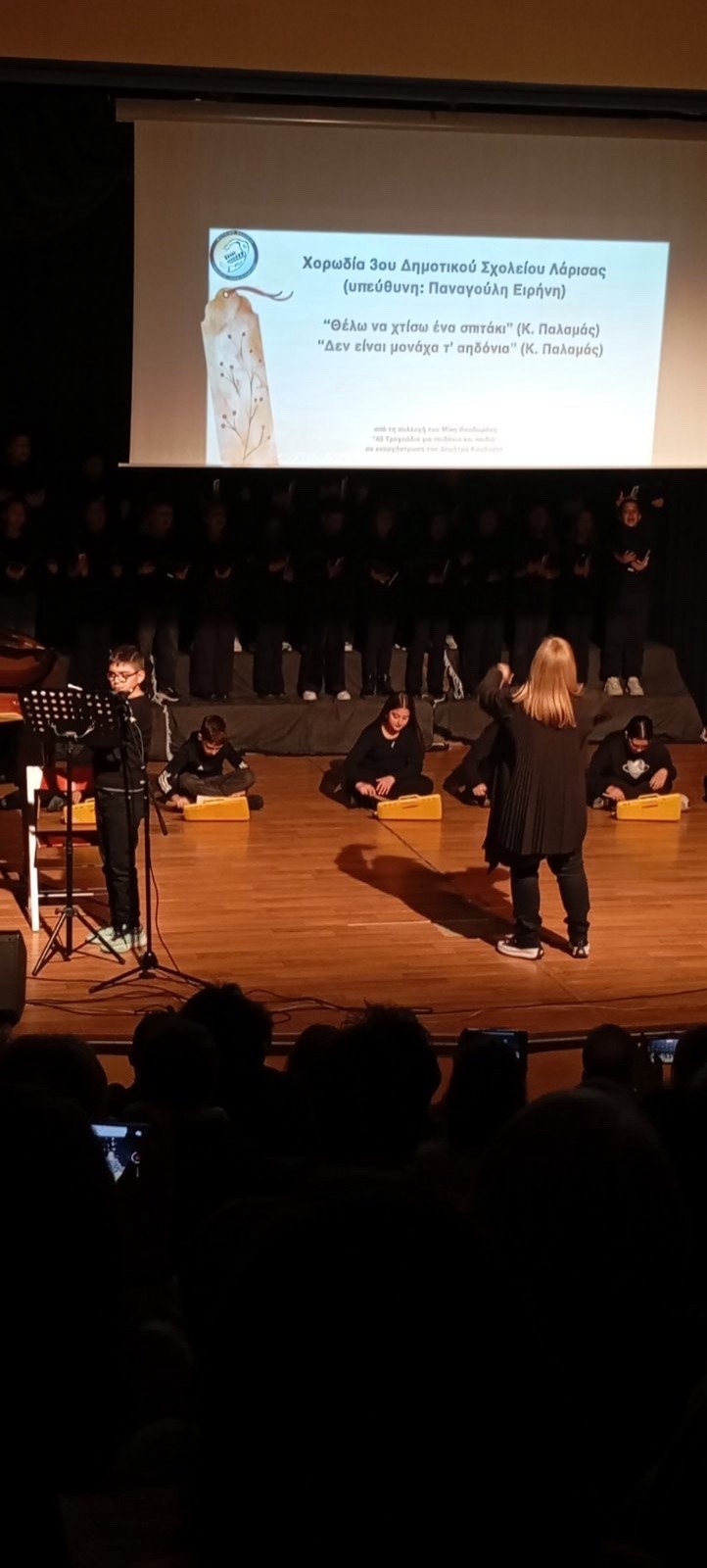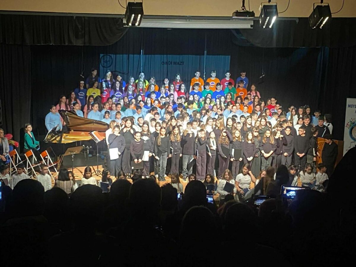 Το χορωδιακό σύνολο MusicArte του Μουσικού σχολείου Λάρισας και χορωδίες Δημοτικών σχολείων του νομού (13ου, 5ου και 36ου, 3ου και Συκουρίου) συναντήθηκαν σε μια θαυμάσια σύμπραξη, αναδεικνύοντας τη μαγεία του ποιητικού λόγου σπουδαίων ποιητών μας μετουσιωμένου σε μουσική, ενώ μοιράστηκαν με το πολυπληθές κοινό τον ενθουσιασμό της ομαδικής δημιουργικής έκφρασης. Σε αυτή την υπέροχη γιορτή του πολιτισμού, στη γιορτή της Τέχνης, όπου οι στίχοι αναβαπτίστηκαν στα νερά της μουσικής η έμπνευση περίσσεψε! Όσο μικροί και μεγαλύτεροι χορωδοί ταξίδευαν το κοινό σε κοινούς τόπους της παιδικής ηλικίας, της απλότητας και της αθωότητας, προβάλλονταν ποιητικές δημιουργίες μαθητών και μαθητριών του Μουσικού συνόλου MusicArte, εμπνευσμένες από τα “παιδικά τραγούδια”.