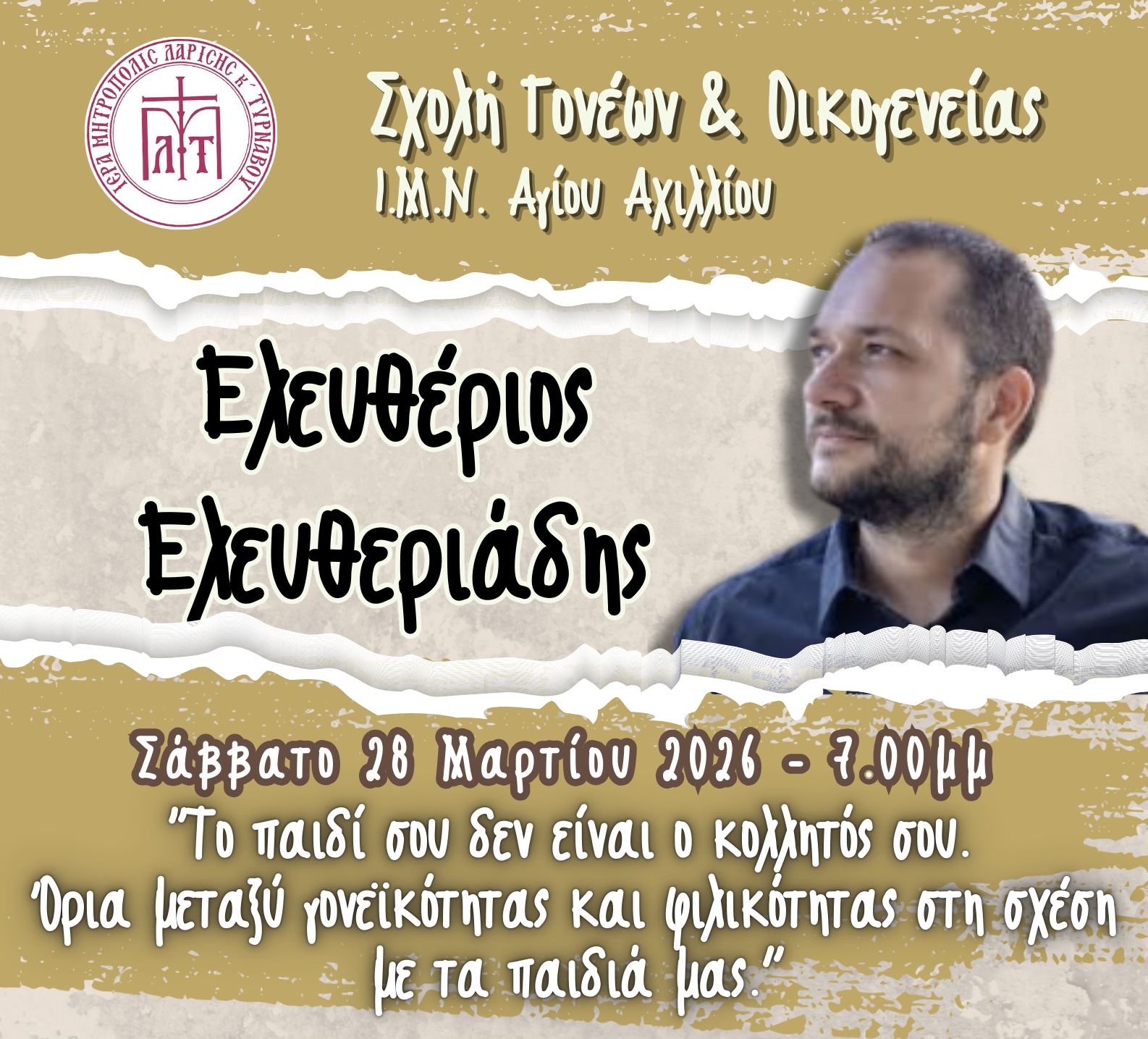 Η επόμενη ομιλία θα γίνει το Σάββατο 28 Μαρτίου 2026, στις 7.00 μ.μ. στον Ι.Μ.Ν.Αγίου Αχιλλίου. Προσκεκλημένος ομιλητής είναι ο κ.Ελευθέριος Ελευθεριάδης, Ψυχολόγος, ο οποίος θα αναπτύξει το θέμα: «Το παιδί σου δεν είναι ο κολλητός σου. Όρια μεταξύ γονεϊκότητας και φιλικότητας στη σχέση με τα παιδιά μας».