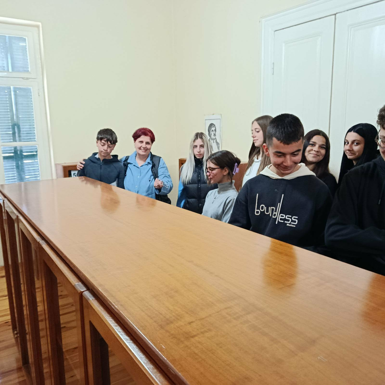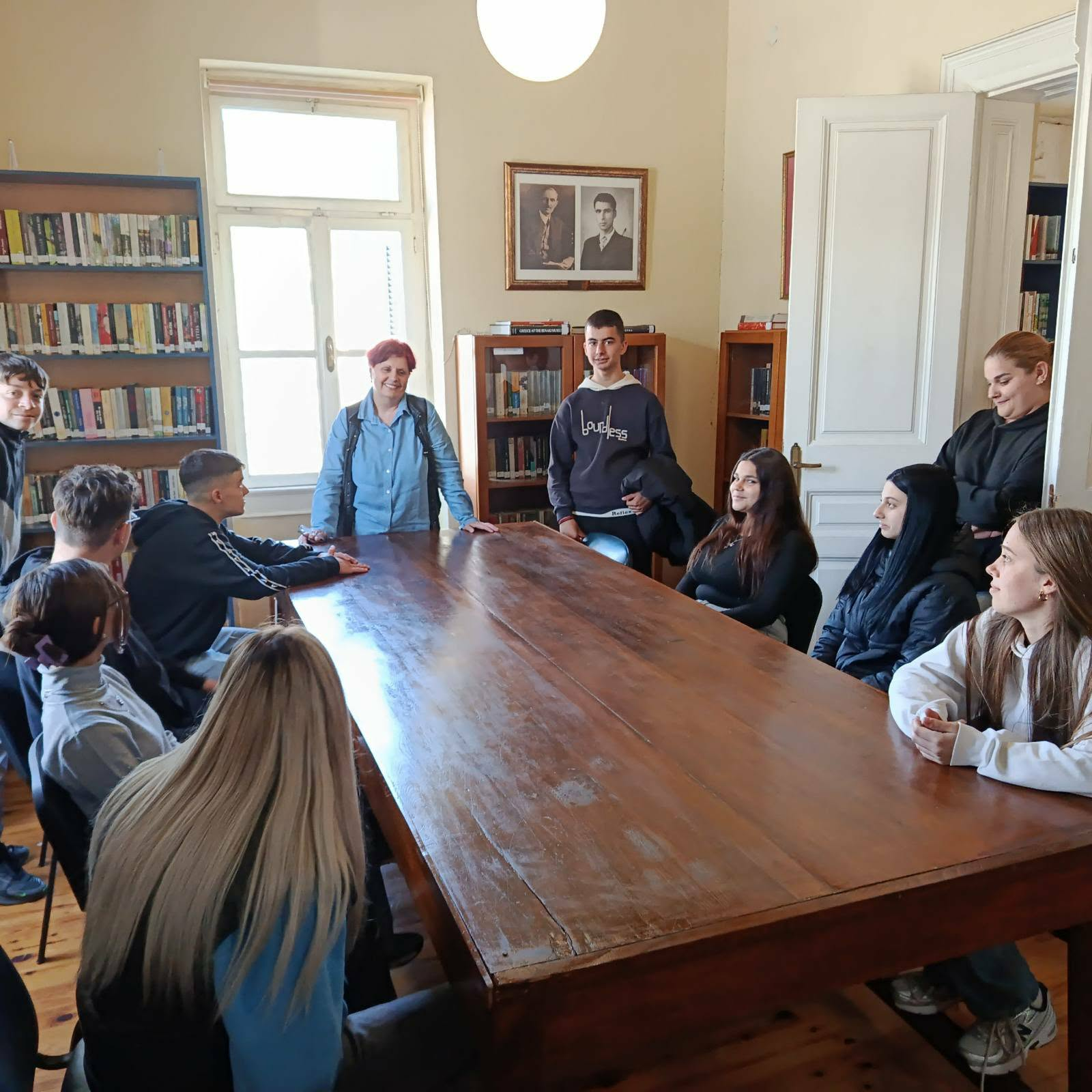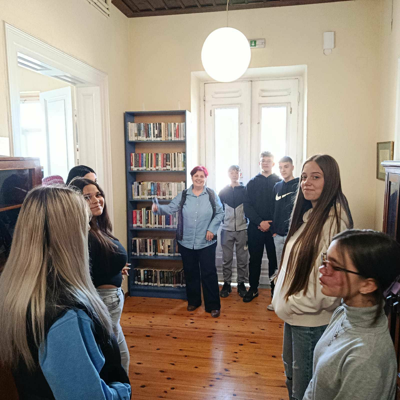 Εκεί τους υποδέχτηκε η φιλόλογος κ. Ντόμπρη Βασιλική η οποία τους ενημέρωσε για την οργάνωση, την καταλογογράφηση και την λειτουργία της βιβλιοθήκης. Επισήμανε ιδιαίτερα τον ρόλο της βιβλιοθήκης στην ενίσχυση της φιλαναγνωσίας σε παιδιά και εφήβους μέσω της διαδικασίας δανεισμού καθώς είναι διαθέσιμα περίπου 15.000 βιβλία.