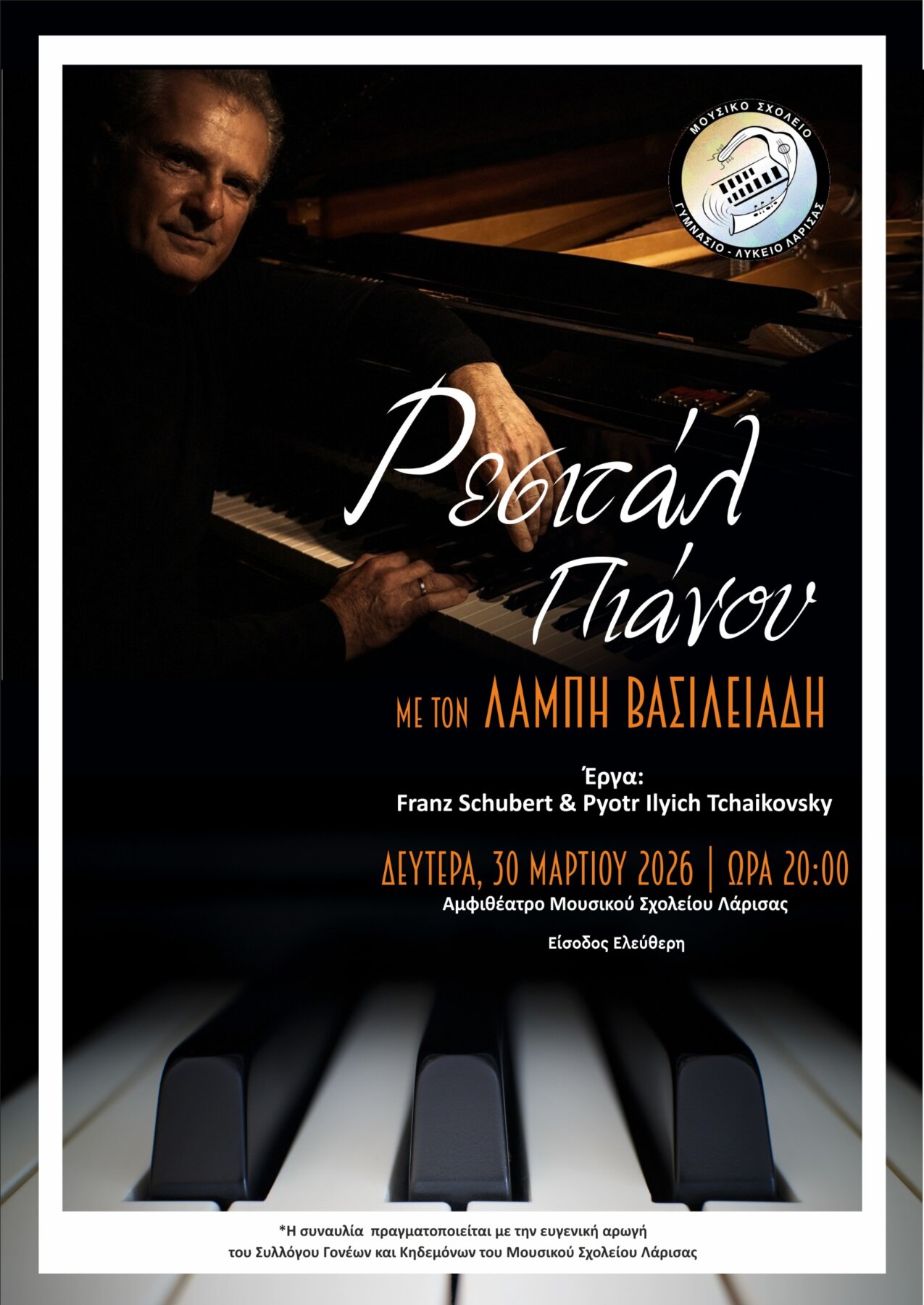 - Δευτέρα 30 Μαρτίου 2026 || 20:00 – Ρεσιτάλ Πιάνου στο Αμφιθέατρο του Μουσικού Σχολείου Λάρισας. Η είσοδος για το κοινό είναι ελεύθερη.