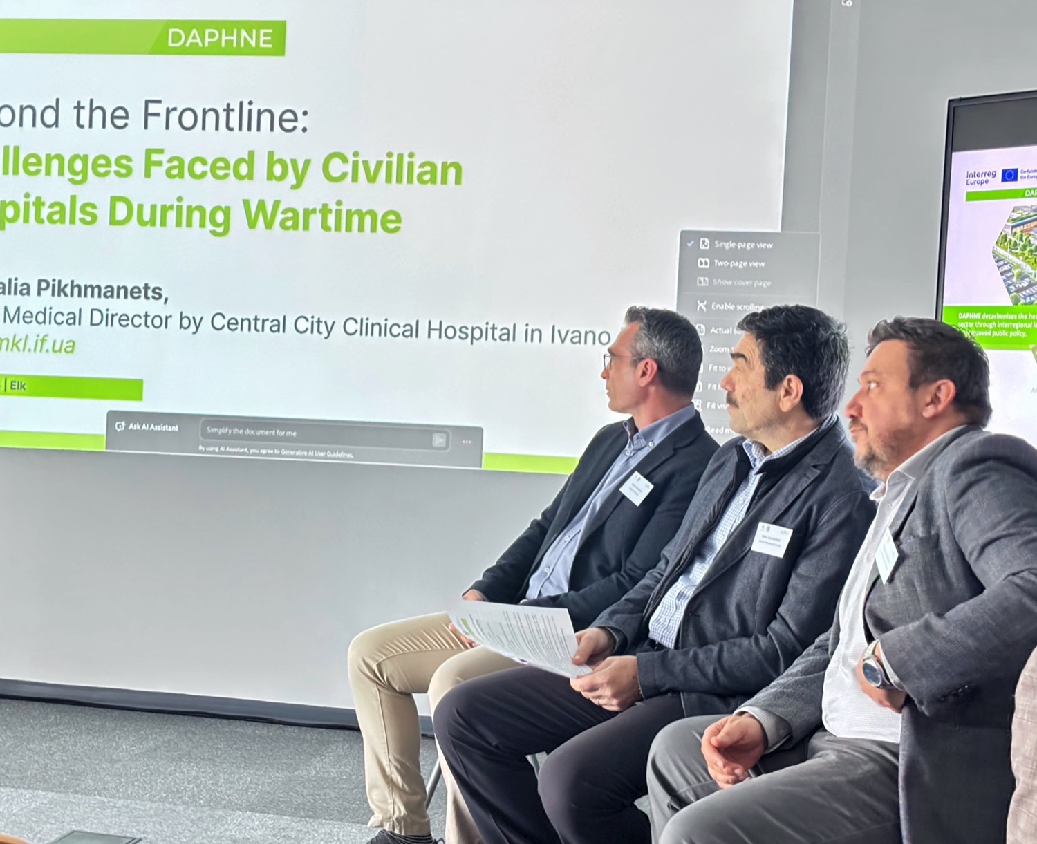 Στο πλαίσιο των παρουσιάσεων, το Γενικό Νοσοκομείο Λάρισας, ως μέλος της τοπικής ομάδας της Περιφέρειας Θεσσαλίας στο έργο DAPHNE, ανέδειξε την εμπειρία του σε πρακτικές βελτιστοποίησης της λειτουργίας των χειρουργείων, με στόχο τη μείωση της κατανάλωσης πόρων και την ενίσχυση της αποδοτικότητας, αναδεικνύοντας τη σημασία της οργανωτικής και λειτουργικής καινοτομίας στη μετάβαση προς πιο βιώσιμα νοσοκομειακά συστήματα καθώς και σε θέματα διαχείρισης επικίνδυνων αποβλήτων υγειονομικών μονάδων με την εφαρμογή ψηφιακών εργαλείων για την ιχνηλασιμότητα και την παρακολούθηση των ροών αποβλήτων. Η εμπειρία αυτή συνδέεται άμεσα με τις εθνικές και ευρωπαϊκές απαιτήσεις για ορθολογική διαχείριση των επικίνδυνων αποβλήτων και τη μετάβαση προς πιο βιώσιμα μοντέλα λειτουργίας των νοσοκομείων.