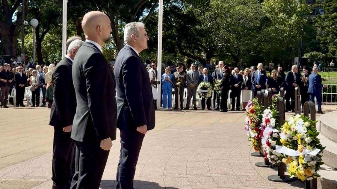 Ακολούθησε κατάθεση στεφάνων στο μνημείο από τον κ. Μάξιμο Χαρακόπουλο και τα μέλη της ελληνικής αποστολής, τον βουλευτή της ΝΔ και πρόεδρο της επιτροπής Ελληνισμού της Διασποράς κ. Φίλιππο Φόρτωμα, τον βουλευτή του ΠΑΣΟΚ κ. Σταύρο Μιχαηλίδη και τον βουλευτή του ΣΥΡΙΖΑ κ. Κώστα Μπάρκα.