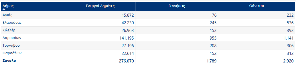 Αναλυτικά ο πίνακας με τις γεννήσεις και τους θανάτους στους μεγάλους δήμους του νομού Λάρισας: