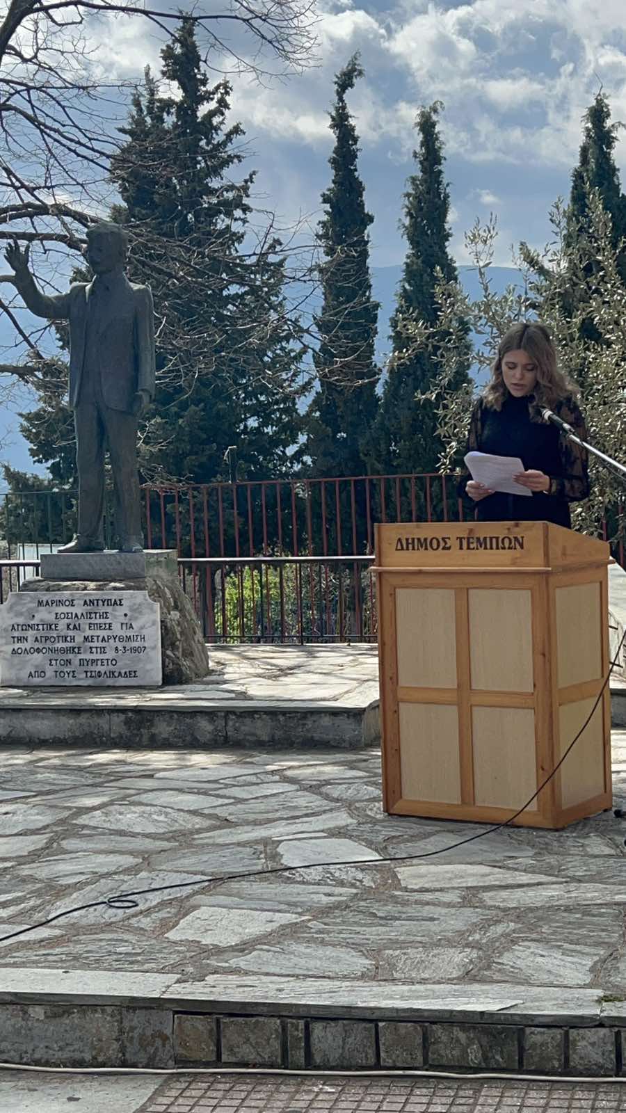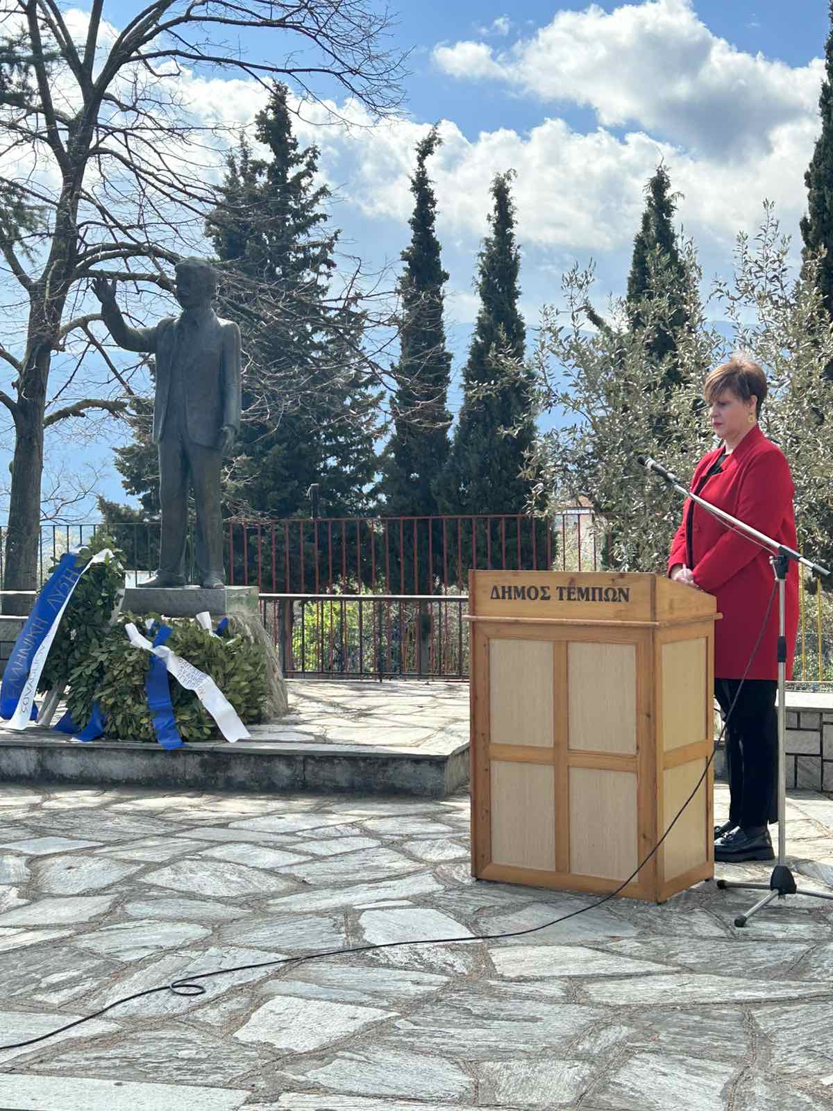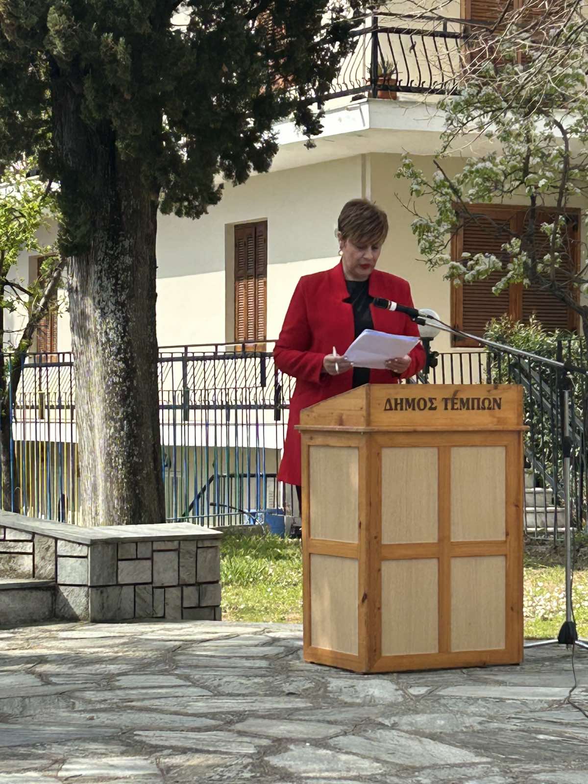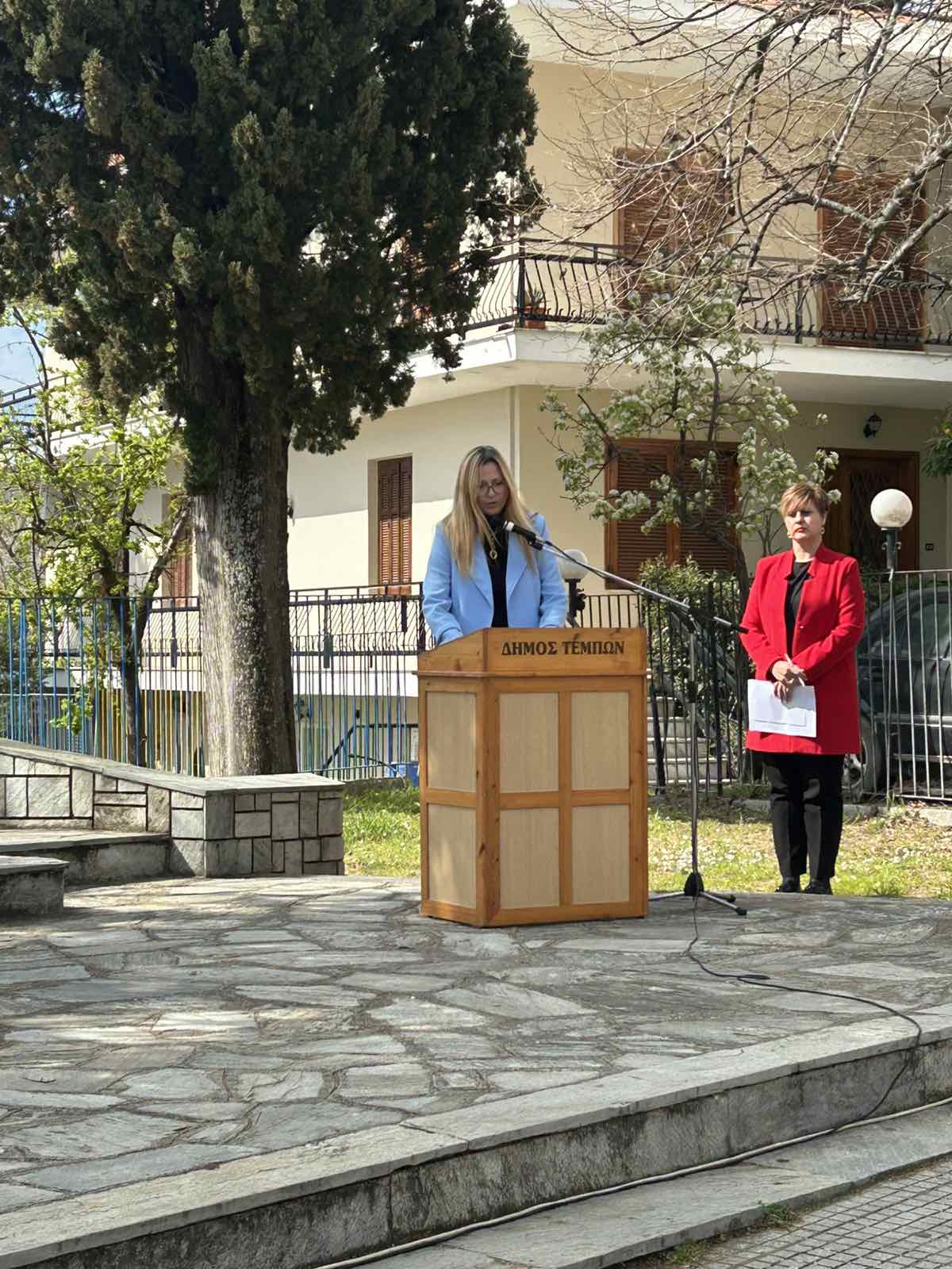 Ακολούθησαν χαιρετισμοί από τον Δήμαρχο Τεμπών κ. Γεώργιο Μανώλη και την εκπρόσωπο της Ελληνικής Λύσης κα Χριστίνα Κοντογιάννη, ενώ η κεντρική ομιλία πραγματοποιήθηκε από την εκπαιδευτικό και ειδική συνεργάτη του Δήμου Τεμπών κα Μαρία Χλωρού. Στη συνέχεια πραγματοποιήθηκε κατάθεση στεφάνων και τηρήθηκε ενός λεπτού σιγή, ενώ η εκδήλωση ολοκληρώθηκε με την ανάκρουση του Εθνικού Ύμνου.