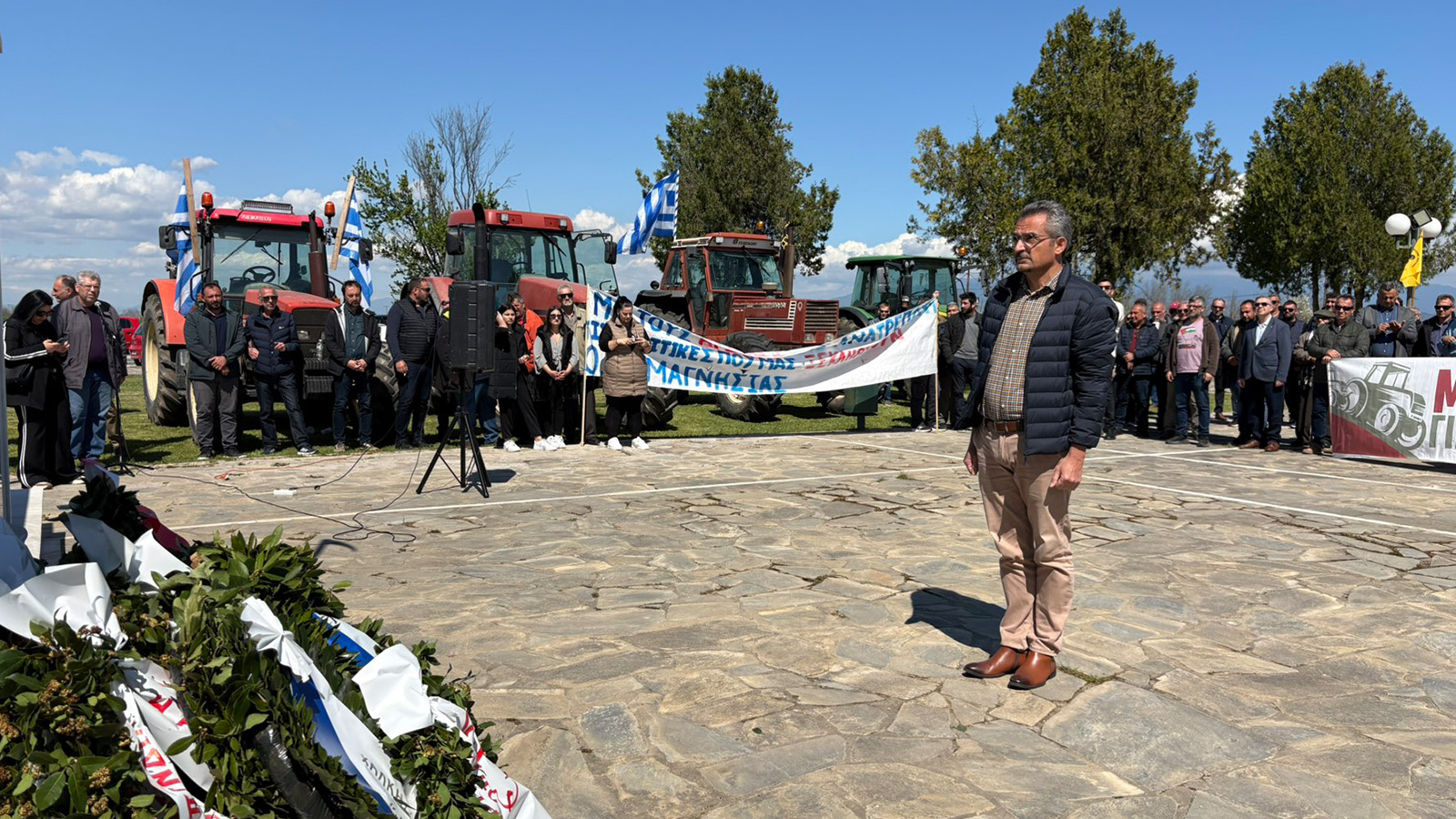 Στο τέλος της συγκέντρωσης κατατέθηκαν στεφάνια από την Πανελλαδική Επιτροπή των Μπλόκων, τις Ομοσπονδίες και τους Αγροτικούς Συλλόγους, το Εργατικό Κέντρο Λάρισας, την δημοτική Αρχή Τυρνάβου.