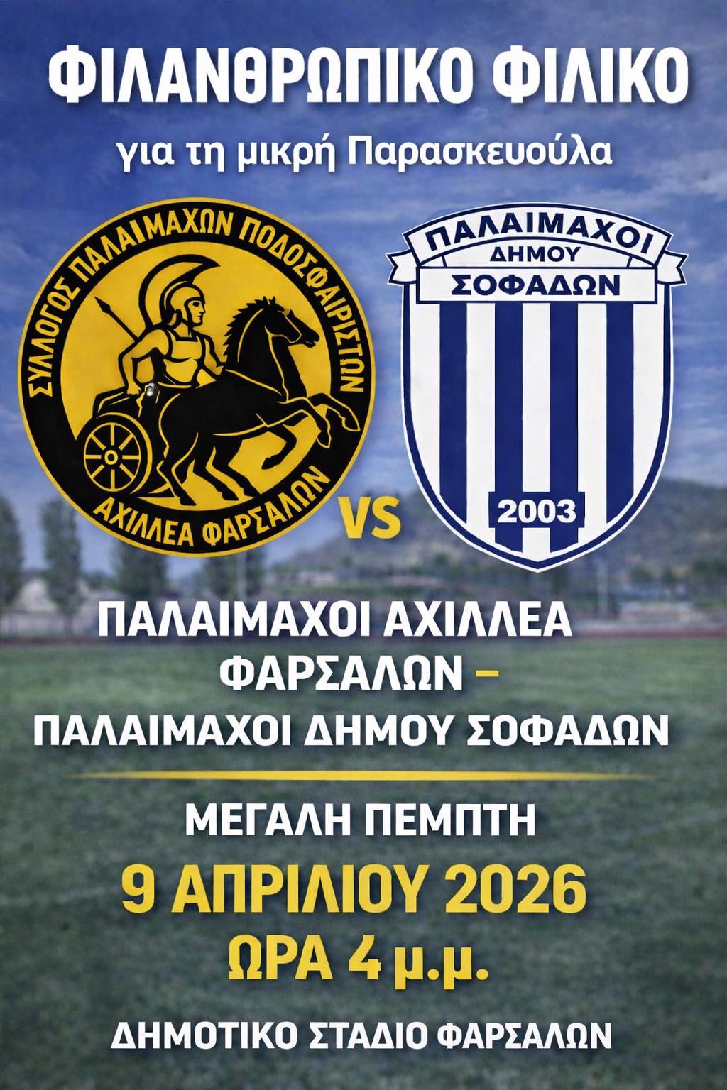 Αυτή τη φορά, αντίπαλοί τους θα είναι οι Παλαίμαχοι Σοφάδων, σε έναν αγώνα που ξεπερνά τα στενά όρια του αθλητισμού και αποκτά έναν βαθιά ανθρώπινο σκοπό. Συγκεκριμένα, θα συγκεντρωθούν χρήματα για την ενίσχυση της οικογένειας της μικρής Παρασκευούλας, του κοριτσιού από τα Φάρσαλα που δίνει τη δική της δύσκολη μάχη με σοβαρό πρόβλημα υγείας.