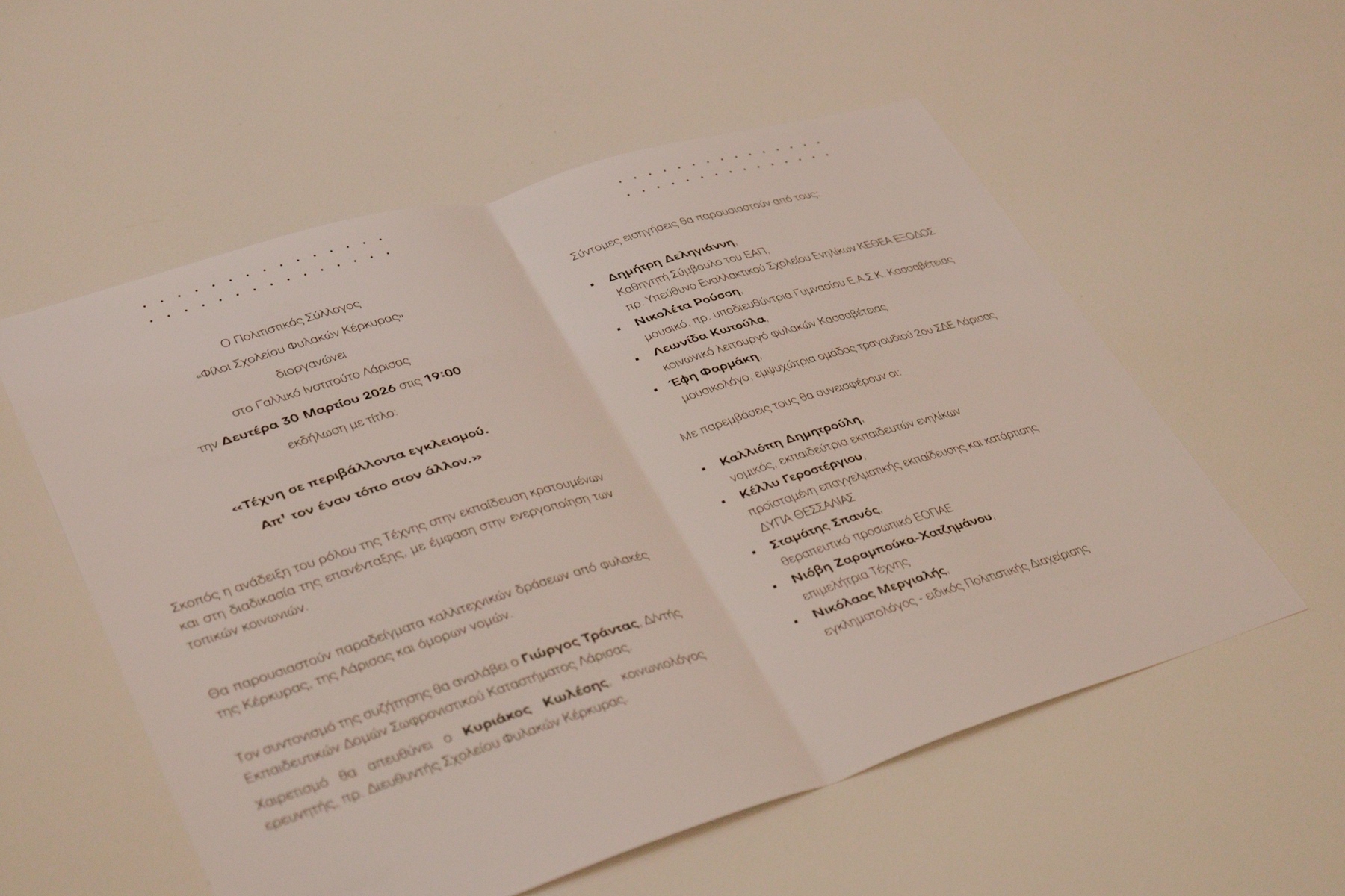 «Το ιδιαίτερο αντικείμενο της εκδήλωσης είναι ο τρόπος με τον οποίον η τέχνη μέσα σε περιβάλλοντα εγκλεισμού επηρεάζει, ή ενίοτε, δεν έχει τη δυνατότητα να εκφράσει την δυναμική της στις τοπικές κοινωνίες. Εμείς από την Κέρκυρα έχουμε φέρει ένα οπτικοακουστικό υλικό να το μοιραστούμε με τους ανθρώπους που έχουν την εμπειρία της επαγγελματικής σχέσης ή της εκπαιδευτικής με τα καταστήματα κράτησης της Λάρισας και των όμορων Νομών, και είμαστε γεμάτοι αγωνία να ακούσουμε, να μοιραστούν και οι υπόλοιποι με εμάς τη δική τους εμπειρία».