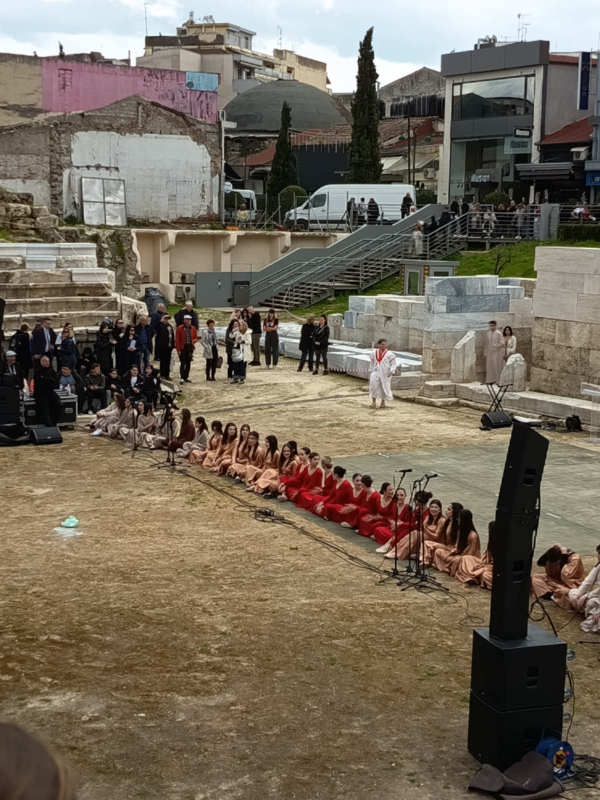 Οι θεατρικές ομάδες των σχολείων παρουσίασαν διασκευασμένα αποσπάσματα από δύο εμβληματικά έργα του αρχαίου δράματος: την «Αντιγόνη» του Σοφοκλή και την «Ειρήνη» του Αριστοφάνη. Μέσα από τη ζωντανή θεατρική έκφραση, οι μαθητές είχαν την ευκαιρία να έρθουν σε άμεση επαφή με τον κόσμο του αρχαίου θεάτρου, βιώνοντας –όπως και οι πρόγονοί μας αιώνες πριν– τον «ἔλεον» και τον «φόβον» που οδηγούν στην πολυπόθητη «κάθαρση».