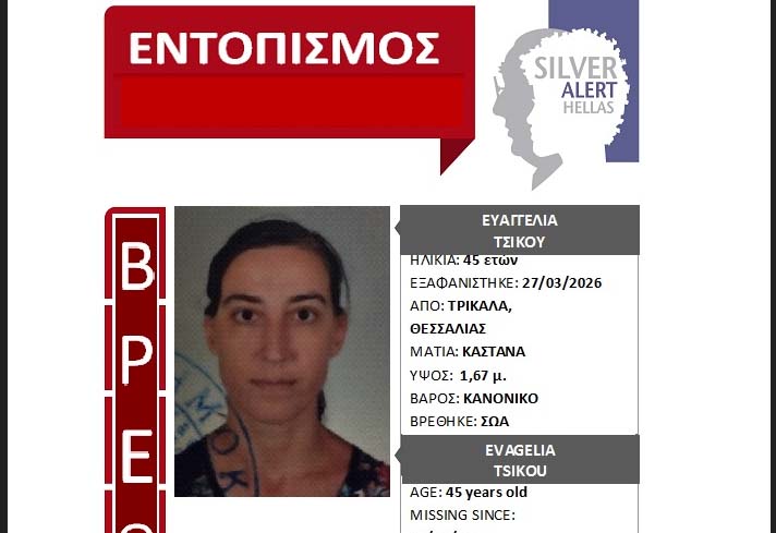 Η ΓΡΑΜΜΗ ΖΩΗΣ, ειδοποιήθηκε από τους οικείους της τα ξημερώματα της 30/03/2026 και μετά τη συγκέντρωση των απαιτούμενων δικαιολογητικών, ενεργοποίησε τον Κοινωνικό Συναγερμό SILVER ALERT, για την κινητοποίηση όλων για την ανεύρεσή της. Υπήρχε η πληροφορία ότι η αναζητούμενη είχε επιβιβαστεί σε λεωφορείο του ΚΤΕΛ Τρικάλων, με προορισμό την Αθήνα. Η υπηρεσία Silver Alert, λίγες ώρες μετά την ενεργοποίηση του Συναγερμού, έλαβε κλήση για την ανεύρεσή της. Η αναζητούμενη, εντοπίστηκε περιπλανώμενη στην περιοχή του Χαλανδρίου Αττικής, από περιπολικό της ΕΛ.ΑΣ. Η 45χρονη είναι καλά στην υγεία της και ασφαλής.