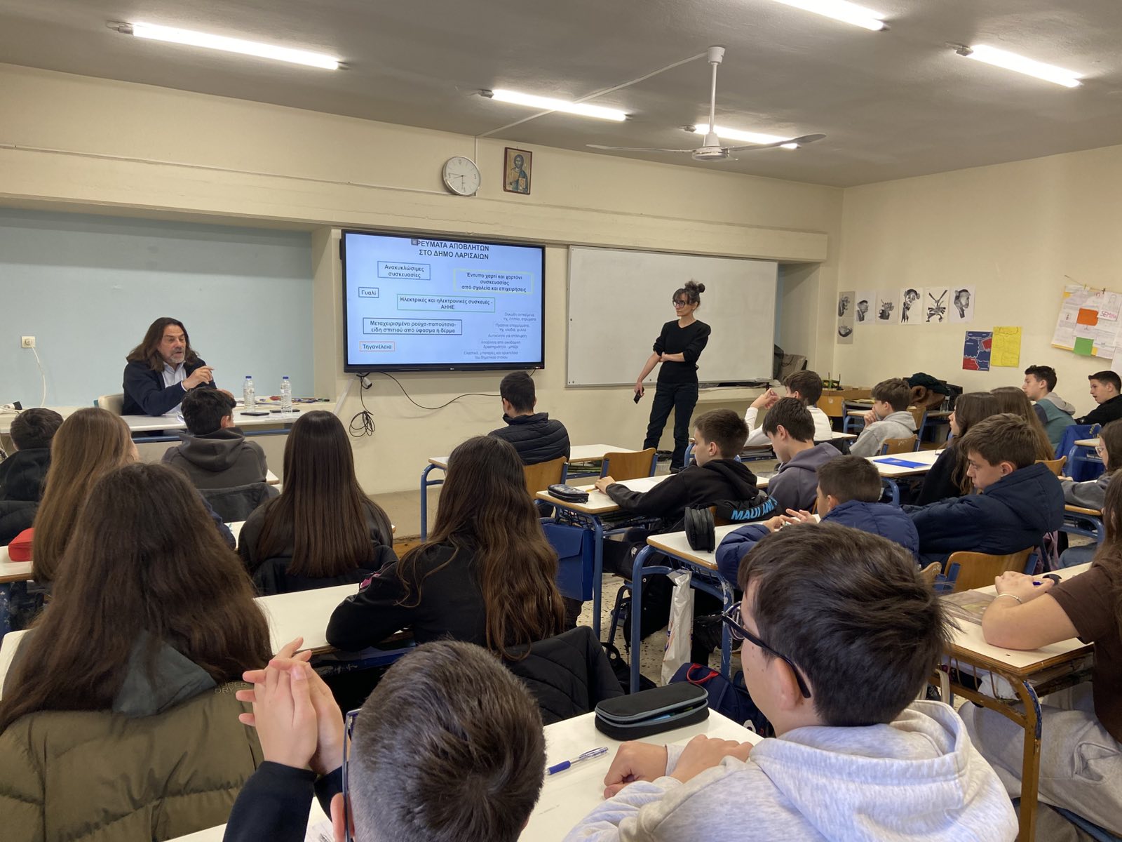 Στο σχολείο παρευρέθηκαν ο Αντιδήμαρχος Καθαριότητας και Ανακύκλωσης του Δήμου Λαρισαίων κ. Λεωνιδάκης Δημήτριος, καθώς και οι εκπρόσωποι του Τμήματος Εναλλακτικής Διαχείρισης και Πράσινων Σημείων κ. Λεονταρίδου Αιμιλία και κ. Βλαχομήτρου Μαρία, οι οποίοι ενημέρωσαν τους μαθητές για τη σημασία της ανακύκλωσης και την ορθή διαχείριση των απορριμμάτων.