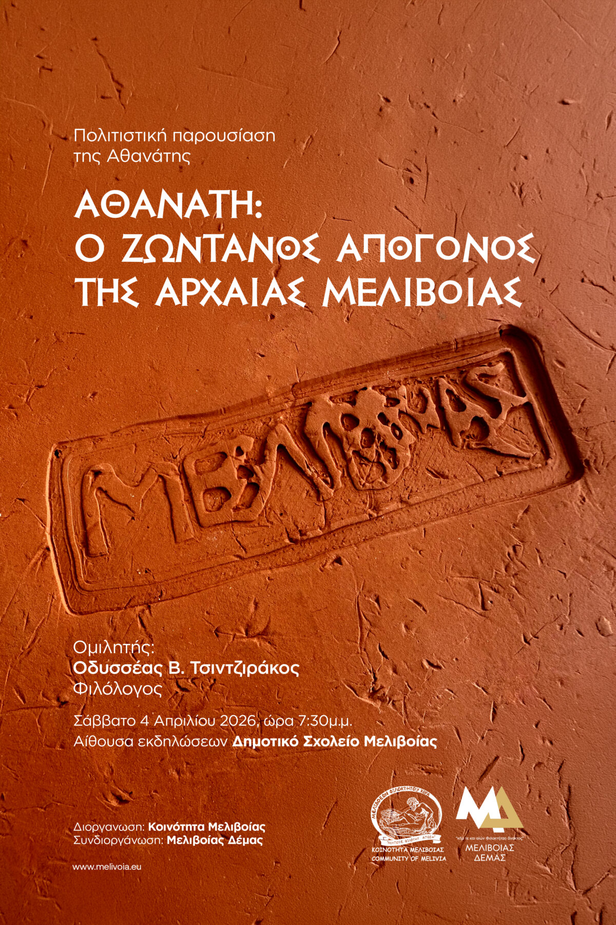 Η εκδήλωση με τίτλο: «Αθανάτη, ο ζωντανός απόγονος της Αρχαίας Μελιβοίας» διοργανώνεται από την Κοινότητα Μελιβοίας και την αστική μη κερδοσκοπική εταιρεία ΜΕΛΙΒΟΙΑΣ ΔΕΜΑΣ.
