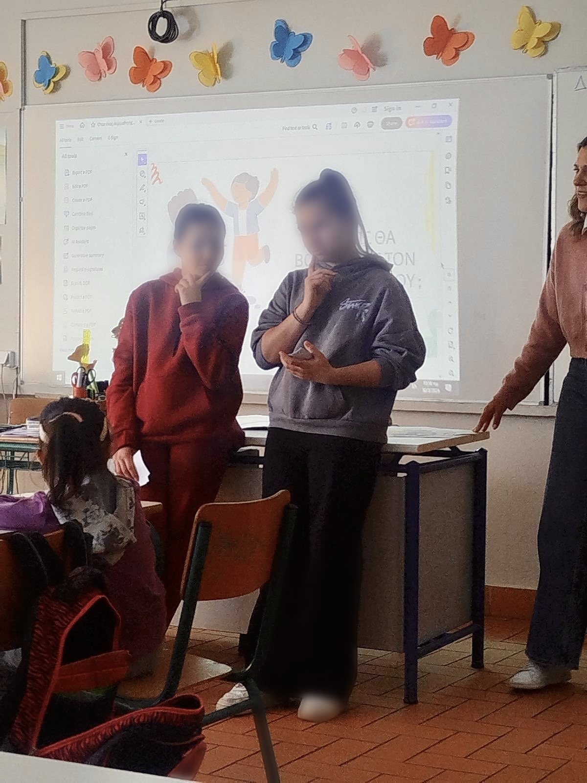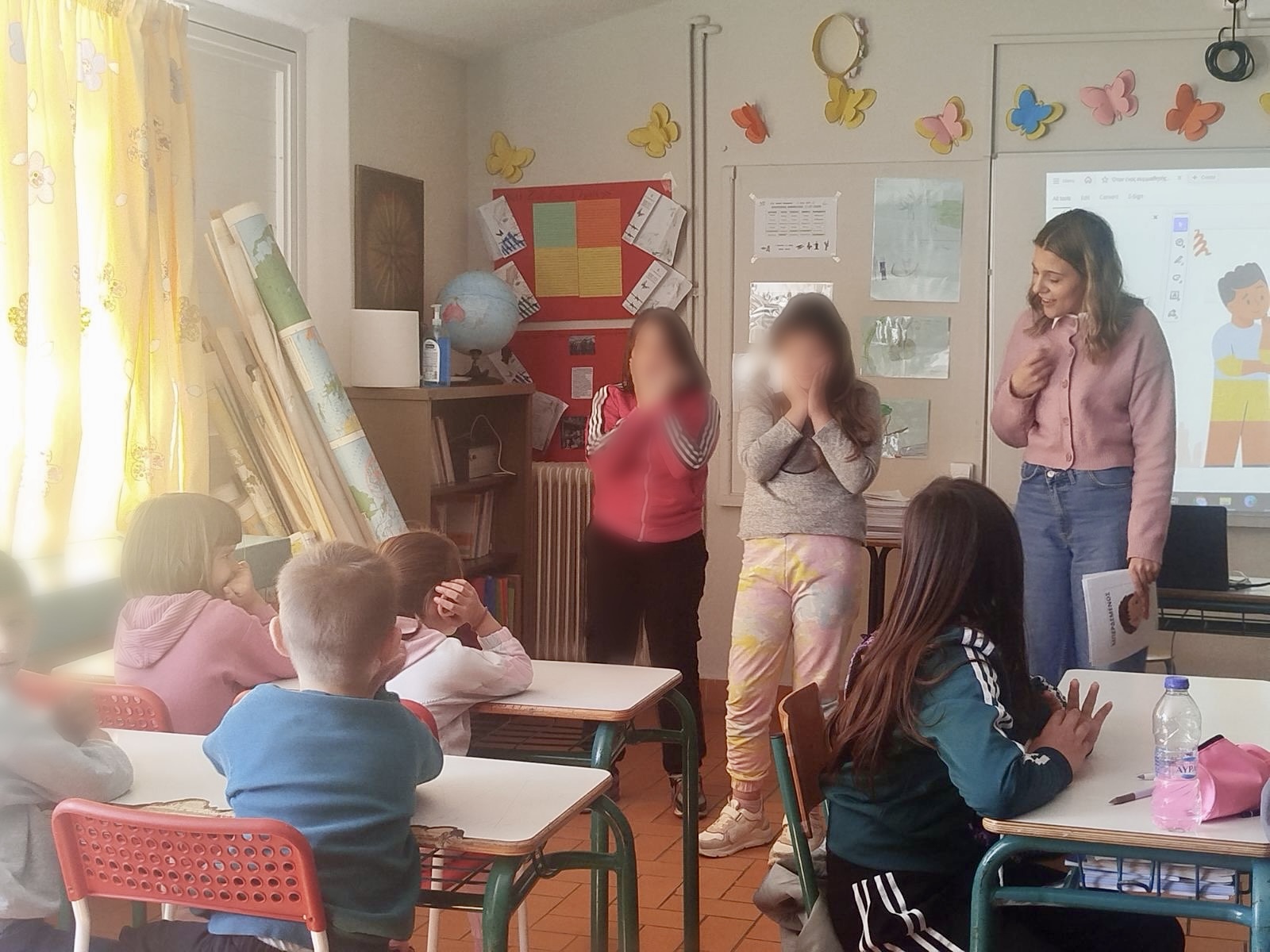 Στη συνέχεια, ακολούθησε βιωματική δράση με τη χρήση καρτελών συναισθημάτων, κατά την οποία οι μαθητές συμμετείχαν ενεργά, αναγνωρίζοντας και αποδίδοντας διαφορετικές εκφράσεις. Η δραστηριότητα αυτή ενίσχυσε την ενσυναίσθηση και την κατανόηση των συναισθημάτων των άλλων, μέσα σε ένα θετικό και δημιουργικό περιβάλλον.