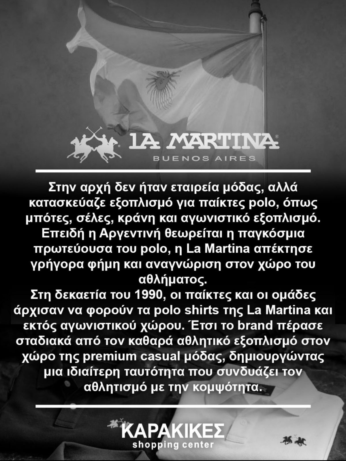 Η LA MARTINA, που ιδρύθηκε το 1985 στο Μπουένος Άιρες της Αργεντινής από τον Lando Simonetti, έχει διαμορφώσει μια ταυτότητα που αντλεί στοιχεία από ένα από τα πιο αριστοκρατικά αθλήματα διεθνώς. Με έμφαση στη λεπτομέρεια και τη διαχρονικότητα, το brand έχει αποκτήσει παρουσία σε αγορές που αναζητούν premium επιλογές ένδυσης.
