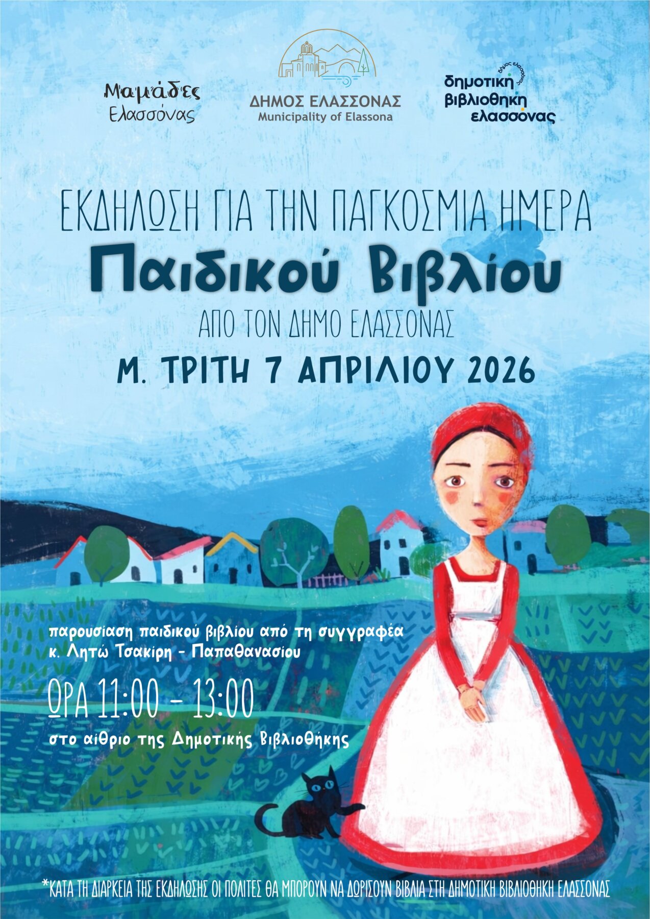 Μια ξεχωριστή εκδήλωση αφιερωμένη στην Παγκόσμια Ημέρα Παιδικού Βιβλίου, που γιορτάζεται κάθε χρόνο στις 2 Απριλίου, με στόχο την ενίσχυση της φιλαναγνωσίας και της δημιουργικής έκφρασης των παιδιών, θα υλοποιηθεί από την Αντιδημαρχία Παιδείας, Ισότητας και Νεολαίας του Δήμου Ελασσόνας, σε συνεργασία με την εθελοντική ομάδα «Μαμάδες Ελασσόνας».