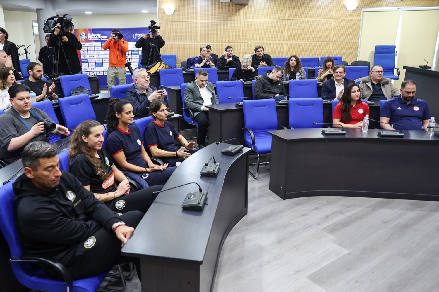 Ακολούθησαν οι τοποθετήσεις των Νίκο Δεληγιάννη, προπονητή της ομάδας Αλίμου, Μαρίας Πάτρα, αρχηγού της ομάδας Αλίμου, Μαρίνας Κοτσιώνη, αρχηγού της ομάδας της Βουλιαγμένης, Κικής Λιόση, προπονήτρια της ομάδας Βουλιαγμένης, Βαλικής Πλευρίτου, αρχηγού της ομάδας του Ολυμπιακού και Γιώργου Ντόσιου, προπονητή της ομάδας Ολυμπιακού, οι οποίοι κάλεσαν τους Λαρισαίους να παρακολουθήσουν τους αγώνες. Όλοι τους ευχαρίστησαν την Περιφέρεια Θεσσαλίας και τον Δήμο Λαρισαίων για την άψογη διοργάνωση και τόνισαν το πόσο σημαντικό είναι οι τελικοί του κυπέλου Final Four Υδατοσφαίρισης να φιλοξενούνται σε επαρχιακές πόλεις, καθώς δίνουν την ευκαιρία σε πολλά παιδιά και νέους εκτός Αττικής να γνωρίσουν το άθλημα και στο κοινό να παρακολουθήσει αγώνες υψηλού επιπέδου.