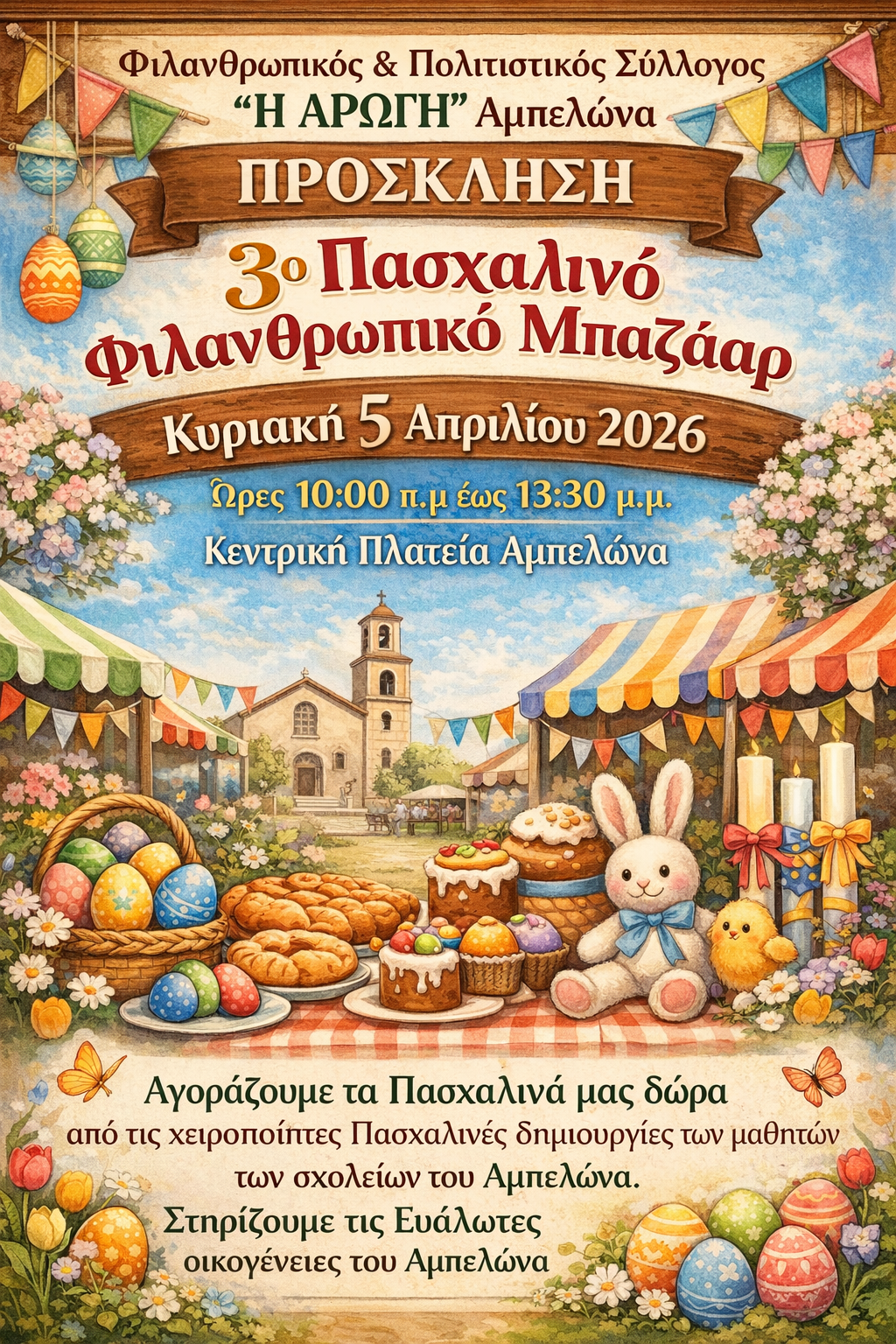 «Σας καλούμε να επιλέξετε τις Πασχαλινές σας λαμπάδες και τα Πασχαλινά σας δώρα από τις χειροποίητες δημιουργίες των μαθητών/τριων των σχολείων μας, που διατίθενται στο 3ο Πασχαλινό Φιλανθρωπικό Bazar ¨Μία Αγκαλιά Αγάπης και Προσφοράς¨, που διοργανώνει την Κυριακή των Βαΐων 5 Απριλίου 2026 και ώρα 10:00 – 13:30 στην κεντρική πλατεία του Αμπελώνα, ο Φιλανθρωπικός και Πολιτιστικός Σύλλογος «Η ΑΡΩΓΗ», στα πλαίσια των δράσεων Αλληλεγγύης, σε συνεργασία με 1ο – 2ο – 3ο – 4ο Νηπιαγωγεία Αμπελώνα, 1ο – 2ο – 3ο Δημοτικά Σχολεία , το Γυμνάσιο Αμπελώνα και το ΚΔΑΠ «ΕΥ ΖΕΙΝ».