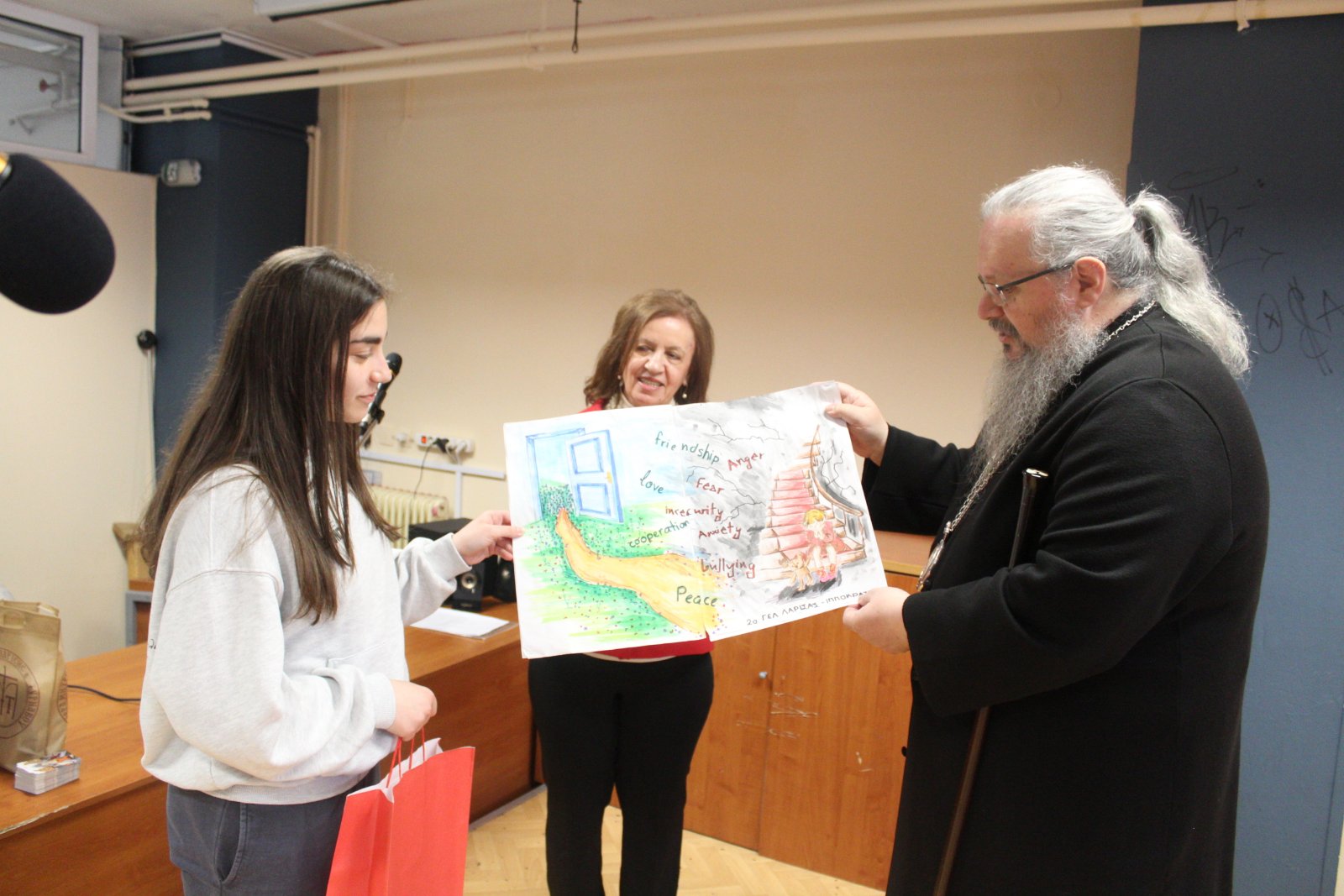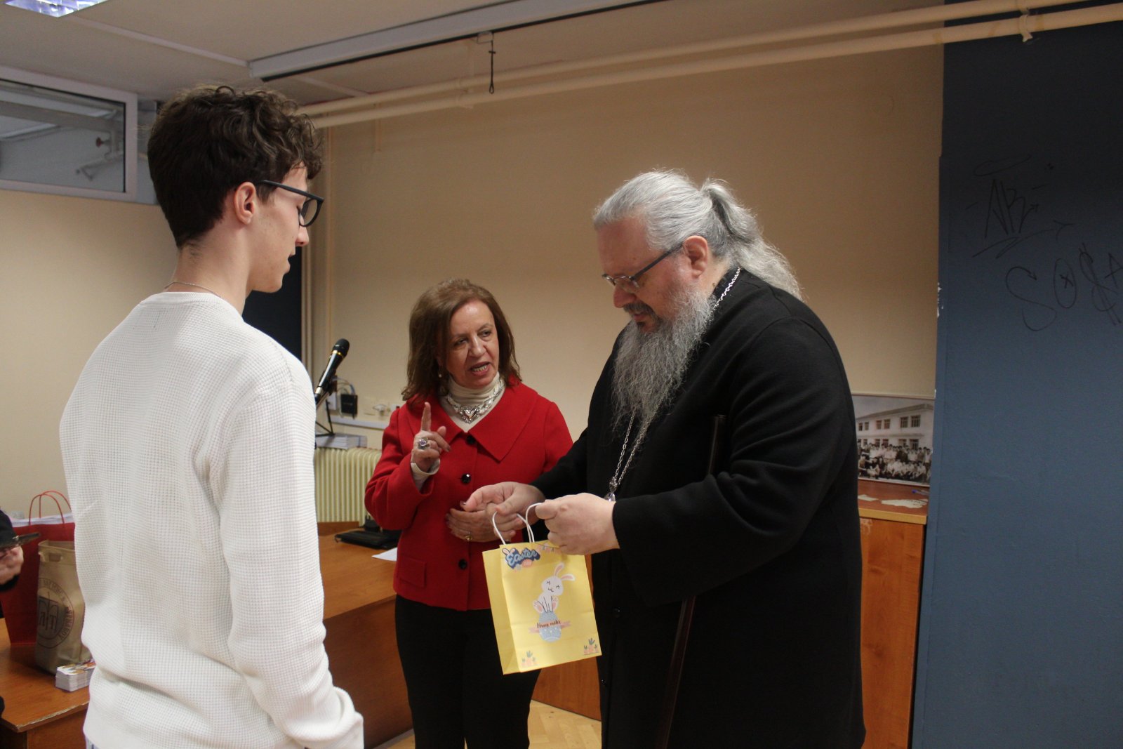 Καταληκτικά, ευχήθηκε σε κάθε μαθητή/ρια και στους καθηγητές/ριες των σχολείων «Καλή Ανάσταση» δίνοντάς τους εικόνα της Αναστάσεως, ενώ οι μαθητές του πρόσφεραν κάρτα με αναστάσιμες ευχές και αφίσα που φιλοτεχνήθηκε στο πλαίσιο της Ημέρας κατά του Σχολικού εκφοβισμού. Τέλος, η Διευθύντρια του 2ου ΓΕΛ κα Μίνα Λίταινα με ομάδα μαθητών ενημέρωσαν τον Μητροπολίτη για την εξαιρετική εμπειρία της συμμετοχής του 2ου ΓΕΛ-Ιπποκράτης στο 10ο Διεθνές Μαθητικό Συνέδριο με θέμα «Διδώ Σωτηρίου. Η Μικρασιάτισσα» που πραγματοποιήθηκε στο Ζωγράφειο Λύκειο της Κωνσταντινούπολης υπό την αιγίδα του Οικουμενικού Πατριάρχη, ευχαρίστησε τον Σεβασμιότατο για τις ευχές του και ευχήθηκε με τη σειρά της «Καλή δύναμη και μακροημέρευση» στο σπουδαίο έργο του.