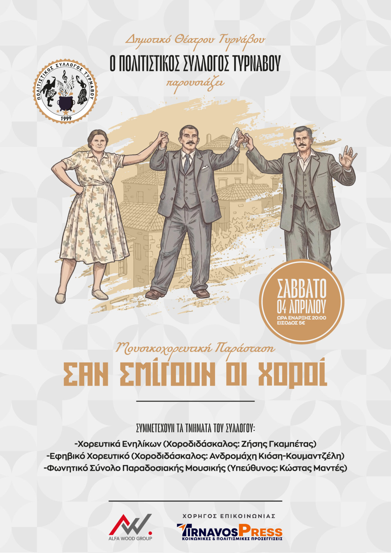 Συμμετέχουν τα χορευτικά τμήματα ενηλίκων, το εφηβικό χορευτικό τμήμα καθώς και το φωνητικό σύνολο παραδοσιακής μουσικής του Πολιτιστικού Συλλόγου Τυρνάβου. Συμμετέχουν επίσης οι μουσικοί: Νάσος Σαμόλαδος (κλαρίνο), Τάσος Σβάρνας (λαούτο & Τραγούδι), Αντώνης Κωστόπουλος (τρομπέτα), Γιάννης Σαμόλαδος (κρουστά) και Κώστας Αντωνίου (ακορντεόν).»