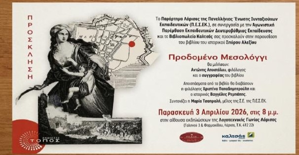 Το παράρτημα Λάρισας της Πανελλήνιας Ένωση Συνταξιούχων Εκπαιδευτικών ( Π.Ε.Σ.ΕΚ.) , σε συνεργασία με την Αγωνιστική Παρέμβαση Εκπαιδευτικών Δευτεροβάθμιας Εκπαίδευσης, το Βιβλιοπωλείο Καλτσα και τις εκδόσεις Τόπος παρουσιάζουν το νέο βιβλίο του ιστορικού Σπύρου Αλεξίου «Προδομένο Μεσσολόγγι» .