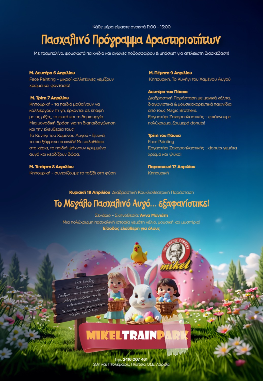 Με ένα πλούσιο πρόγραμμα δραστηριοτήτων για παιδιά, το MIKEL Train Park στο πάρκο του ΟΣΕ στη Λάρισα ανοίγει τις πύλες του κατά την πασχαλινή περίοδο, προσφέροντας καθημερινά, από τις 11:00 έως τις 15:00, έναν χώρο δημιουργικής απασχόλησης και παιχνιδιού.