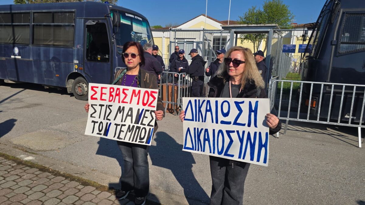 Κρατώντας τα χέρια πλακάτ που αναγράφουν «σεβασμός στις μάνες των Τεμπών» και «Δικαίωση, δικαιοσύνη» δύο Λαρισαίες εκπαιδευτικοί, βρέθηκαν το πρωί της Μεγάλης Δευτέρας έξω από το χώρο όπου συνεχίζεται η κύρια δίκη για να διαδηλώσουν.