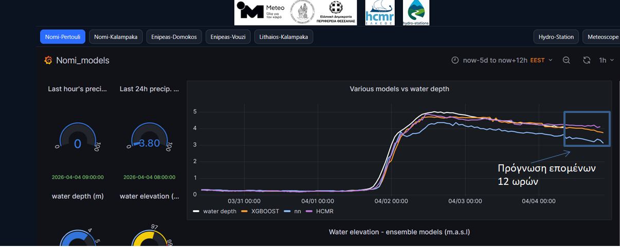 • ενώ παράλληλα ενσωματώνει δυναμικά τις πραγματικές μετρήσεις στάθμης από τους υδρολογικούς σταθμούς, βελτιώνοντας συνεχώς την ακρίβεια της πρόγνωσης.