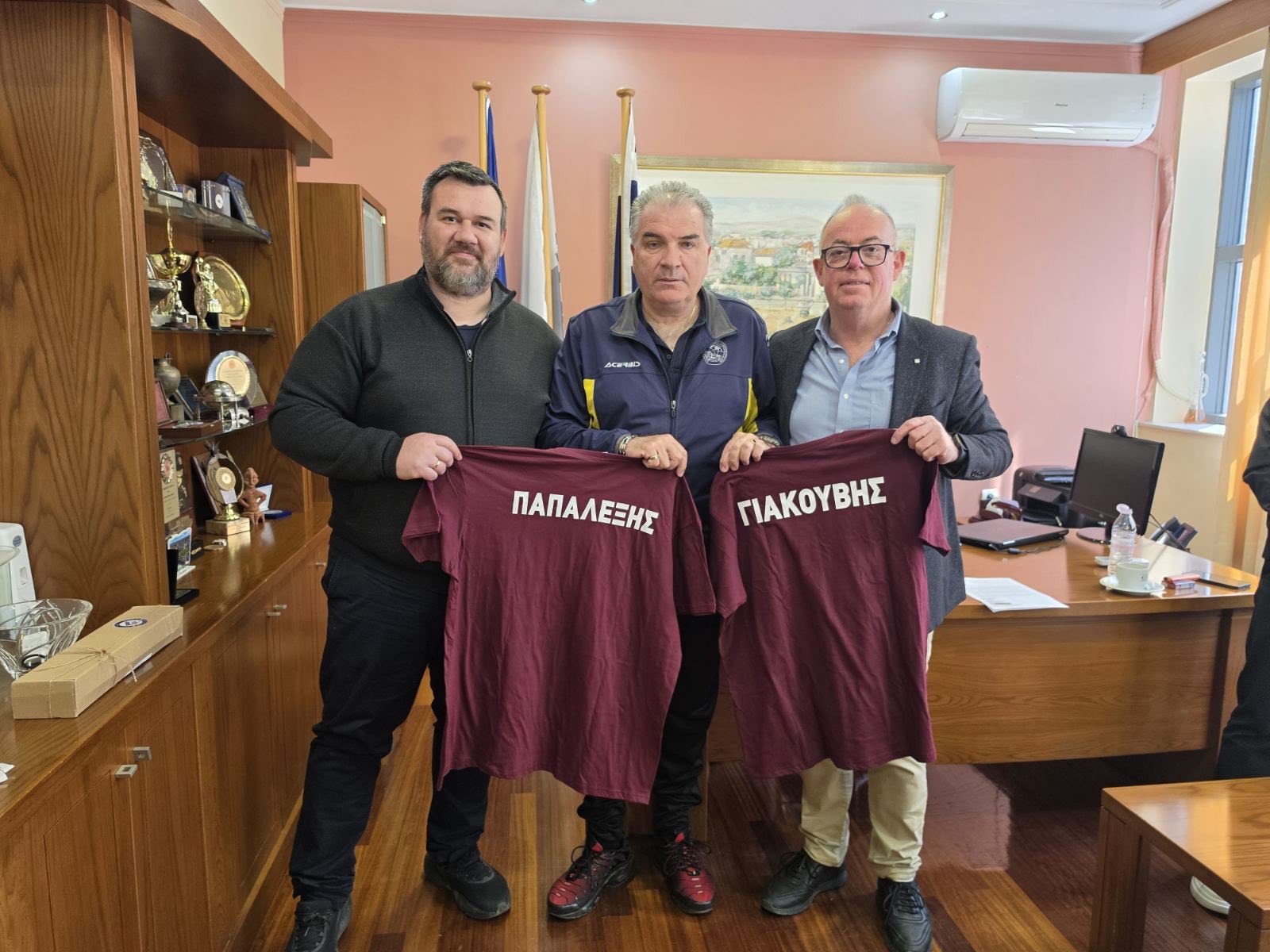 Οι εκπρόσωποι του συνδέσμου προσέφεραν αναμνηστικές φανέλες στον Πρόεδρο και τον Α’ Αντιπρόεδρο του Επιμελητηρίου Λάρισας.