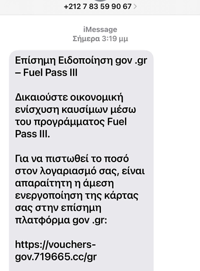 Οι αποδέκτες του μηνύματος ενημερώνονται ότι δικαιούνται την οικονομική ενίσχυση για τα καύσιμα μέσω του υποτιθέμενου «Fuel Pass III» και καλούνται να ενεργοποιήσουν άμεσα την κάρτα τους μέσω συνδέσμου. Έτσι οδηγούνται σε μια ψεύτικη ιστοσελίδα, η οποία μιμείται την επίσημη πλατφόρμα του gov.gr, με σκοπό την υποκλοπή ευαίσθητων δεδομένων όπως στοιχεία τραπεζικών λογαριασμών και προσωπικές πληροφορίες των πολιτών. Επιπρόσθετα, στο SMS χρησιμοποιείται και πίεση χρόνου, καθώς αναφέρεται στον παραλήπτη ότι η μη άμεση ενεργοποίηση θα οδηγήσει σε απώλεια της επιδότησης.