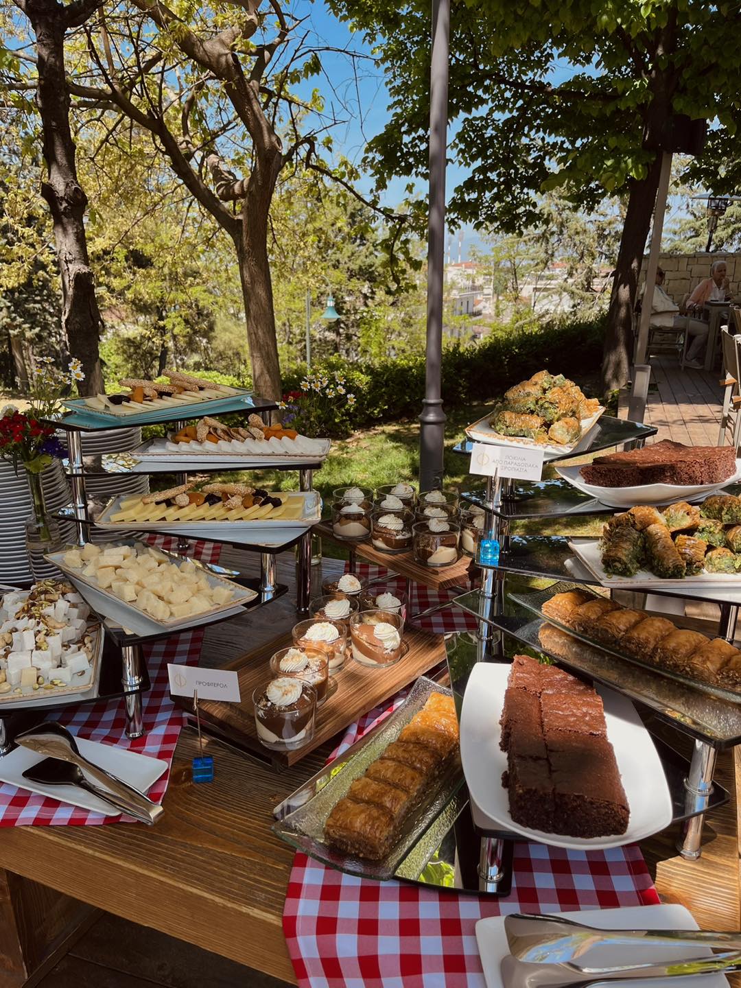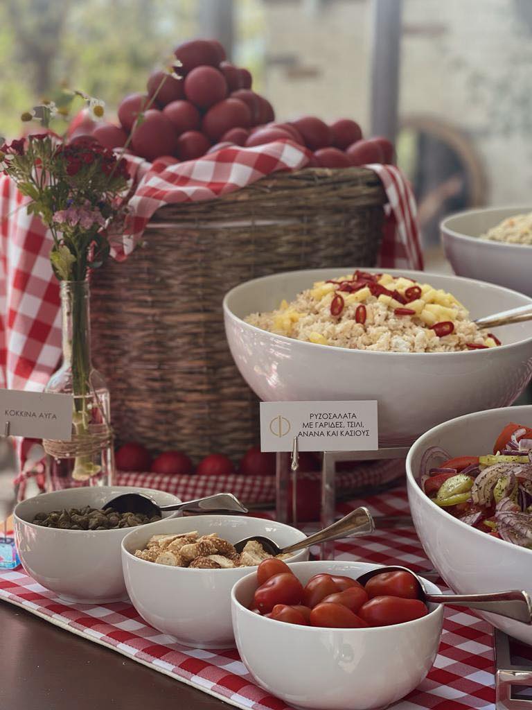 Την Κυριακή του Πάσχα, ο ανθισμένος κήπος μεταμορφώνεται σε σκηνικό ελληνικού χωριού: αρνιά ψήνονται με τον παραδοσιακό τρόπο και ένας πλούσιος μπουφές γεμάτος πασχαλινές λιχουδιές περιμένει να τον απολαύσουν μικροί και μεγάλοι.