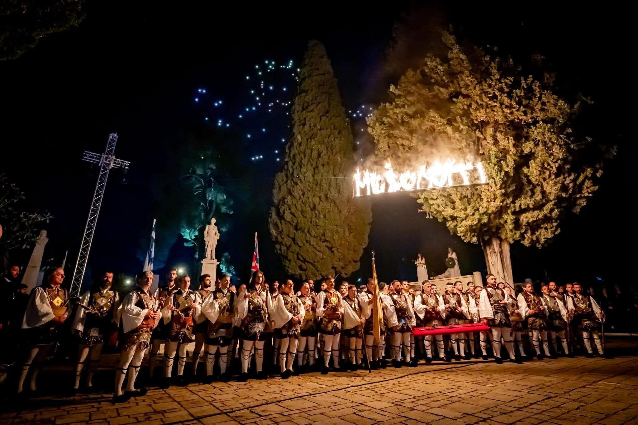 Ακολούθησε το δρώμενο της αναπαράστασης της νύχτας εκείνης και στη συνέχεια η ανατίναξη. Ρίχνανε και κανονιές. Και μετά το εντυπωσιακό drone show στον ουρανό με σύμβολα εμπνευσμένα από την Έξοδο. Κάπου εκεί επανερχόσουν στην πραγματικότητα, στο σήμερα και την τεχνολογία. Στο παλιό Νοσοκομείο προβάλανε εικόνες της Μάχης με light installation. Υπήρχαν Ήρωες που μιλούσαμε με τεχνητή νοημοσύνη. Ένα τεράστιος γερανός ύψωνε την σημαία της Επανάστασης, τη λευκή με τον κυανό σταυρό, τόσο ψηλά που την έβλεπες από όλη την πόλη. Αυτή τη σημαία, της Επανάστασης, είχαν κρεμασμένη και σε όλα τα σπίτια.
