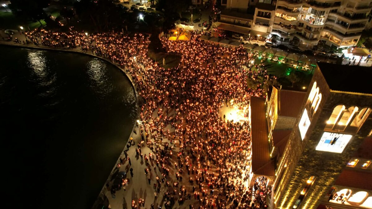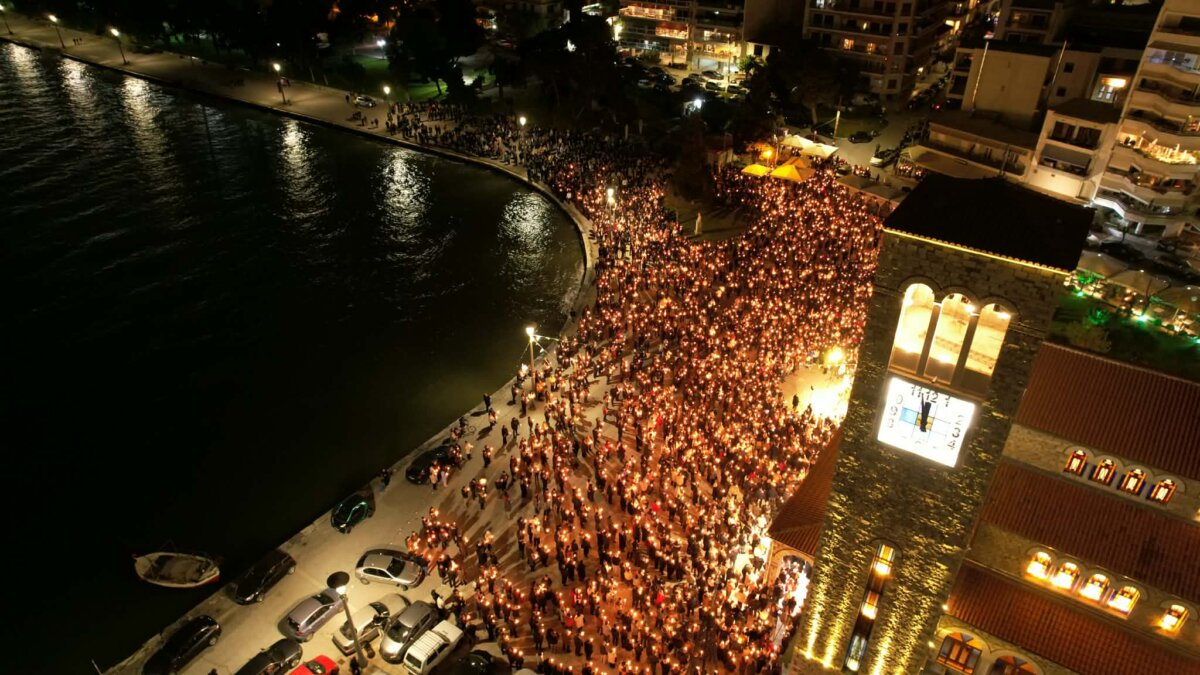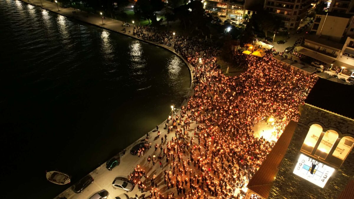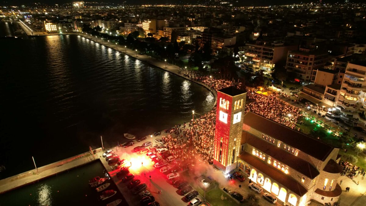 Ξεχωριστή ήταν η εικόνα από τον Ιερό Ναό Αγίων Κωνσταντίνου και Ελένης, όπου πλήθος κόσμου κατέκλυσε τον προαύλιο χώρο και την παραλιακή ζώνη. Εναέριες λήψεις αποτύπωσαν το εντυπωσιακό σκηνικό, με εκατοντάδες αναμμένες λαμπάδες να φωτίζουν τη νύχτα και να δημιουργούν μια μοναδική εικόνα πίστης και κατάνυξης δίπλα στη θάλασσα.