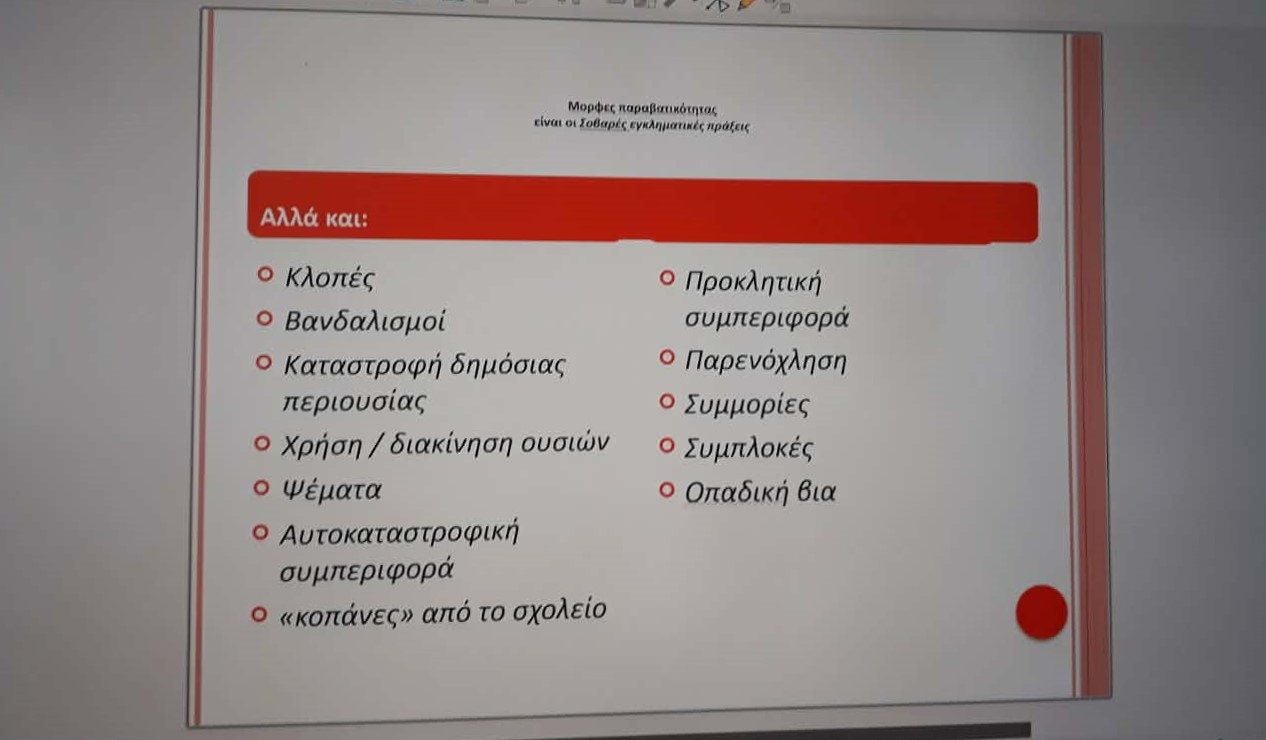 Συγκεκριμένα, στο 7ο ΕΠΑΛ Λάρισας, πραγματοποιήθηκε ενημερωτική ομιλία που απευθυνόταν σε μαθητές της Α’ Λυκείου, με στόχο της δράσης την ευαισθητοποίηση των εφήβων γύρω από τις αιτίες της παραβατικής συμπεριφοράς -όπως οι κοινωνικοοικονομικοί παράγοντες, το οικογενειακό περιβάλλον και η επιρροή των συνομηλίκων, καθώς και η ανάλυση των συνεπειών για τον θύτη, το θύμα και την οικογένεια. Η δράση υπογράμμισε την ανάγκη συνεργασίας μεταξύ σχολείου, οικογένειας και κοινωνικών υπηρεσιών.