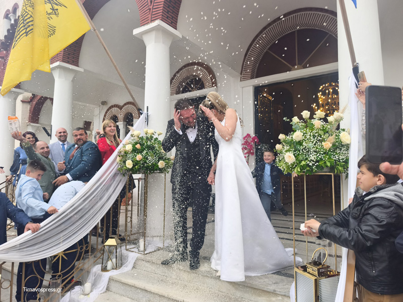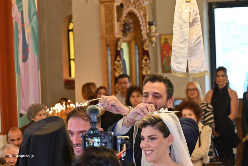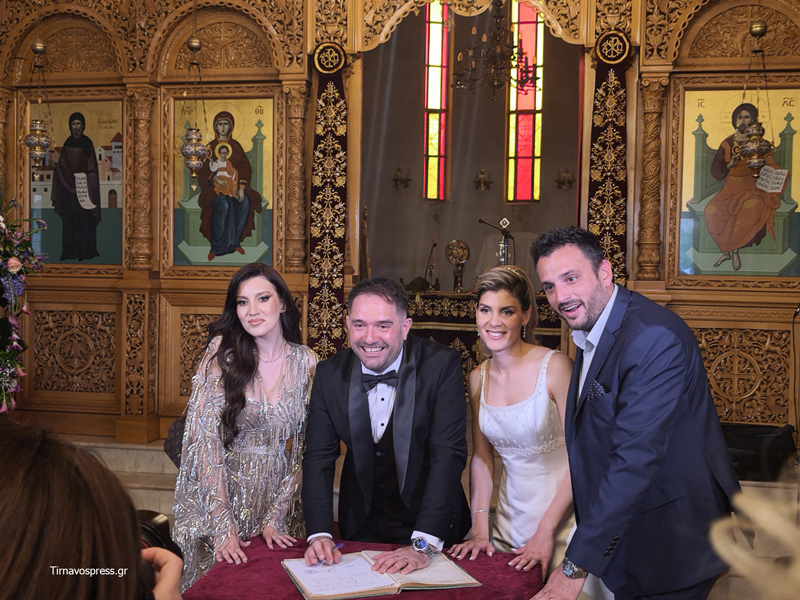 Στο πλευρό του ζευγαριού στάθηκαν ως κουμπάροι ο Δήμαρχος Τυρνάβου, Στέλιος Τσικριτσής και η σύντροφος του Ειρήνη, ενώ πνευματικοί γονείς του μικρού Νικόλαου έγιναν οι νονοί Σταύρος και Λία Γεωργίου.