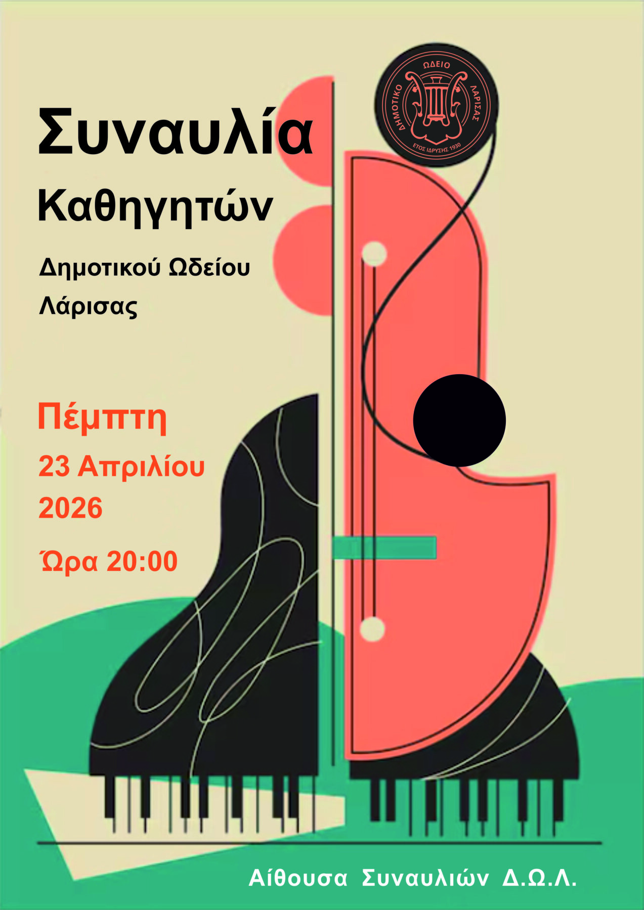 Η συναυλία θα πραγματοποιηθεί την Πέμπτη 23 Απριλίου και ώρα 20:00 στην Αίθουσα Συναυλιών του Δημοτικού Ωδείου Λάρισας.
