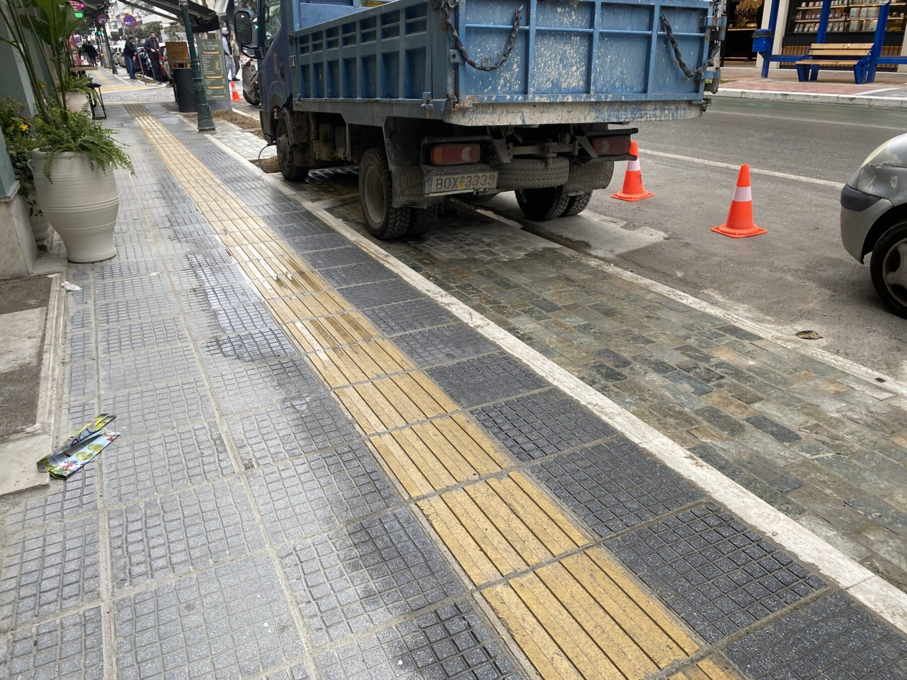 Αμέσως μετά τις γιορτές του Πάσχα επέστρεψαν τα συνεργεία του Δήμου Βόλου στην οδό Δημητριάδος για τη συνέχιση της ανακατασκευής των πεζοδρομίων, στα οποία σήμερα παρουσιάζονται προβλήματα. Ξεκολλημένα πλακάκια, οδηγοί τυφλών που «οδηγούν» πάνω σε στάσεις λεωφορείων, ράμπες που περνούν πάνω από σχάρες ομβρίων…