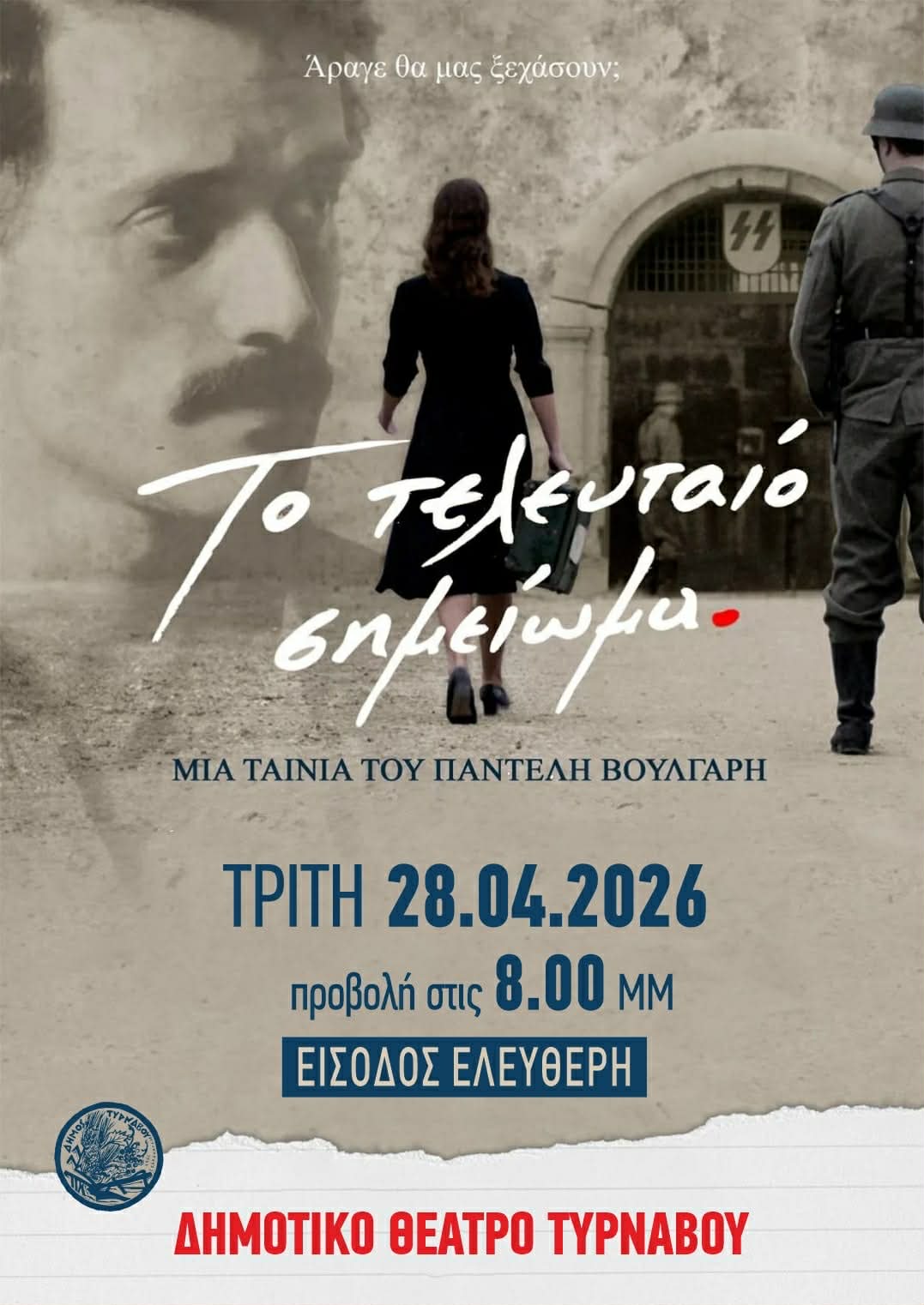 Ο Δήμος Τυρνάβου και η Αντιδημαρχία Πολιτισμού προσκαλούν τους πολίτες στην προβολή της ταινίας «Το Τελευταίο Σημείωμα», σε σκηνοθεσία του Παντελή Βούλγαρη.