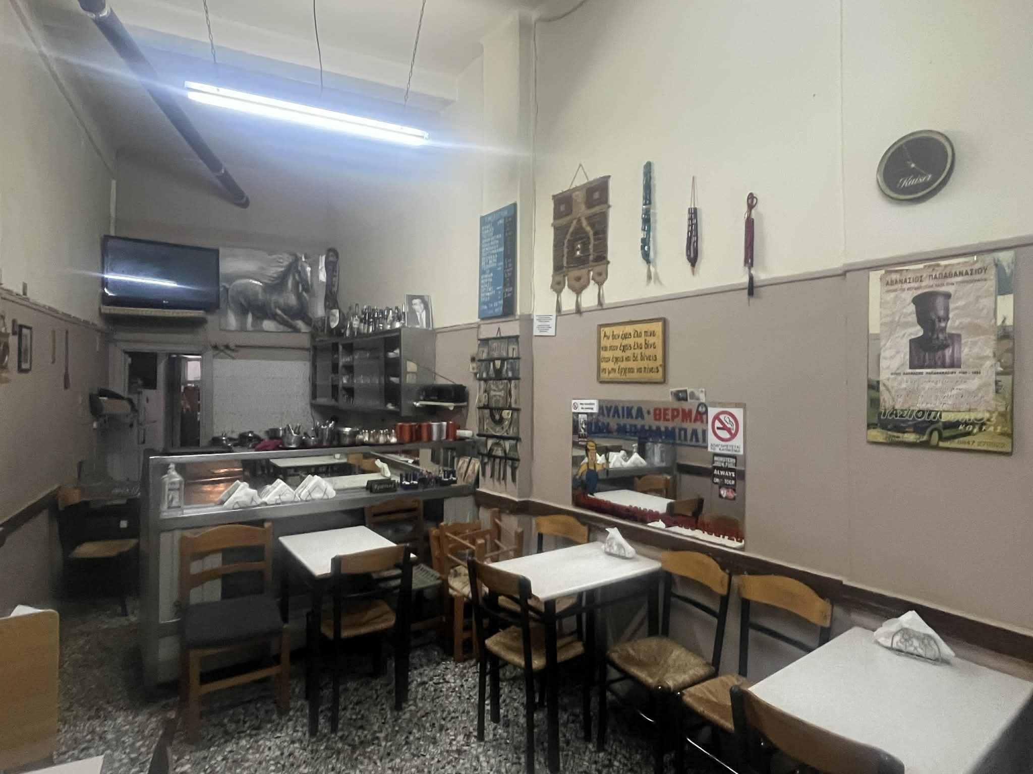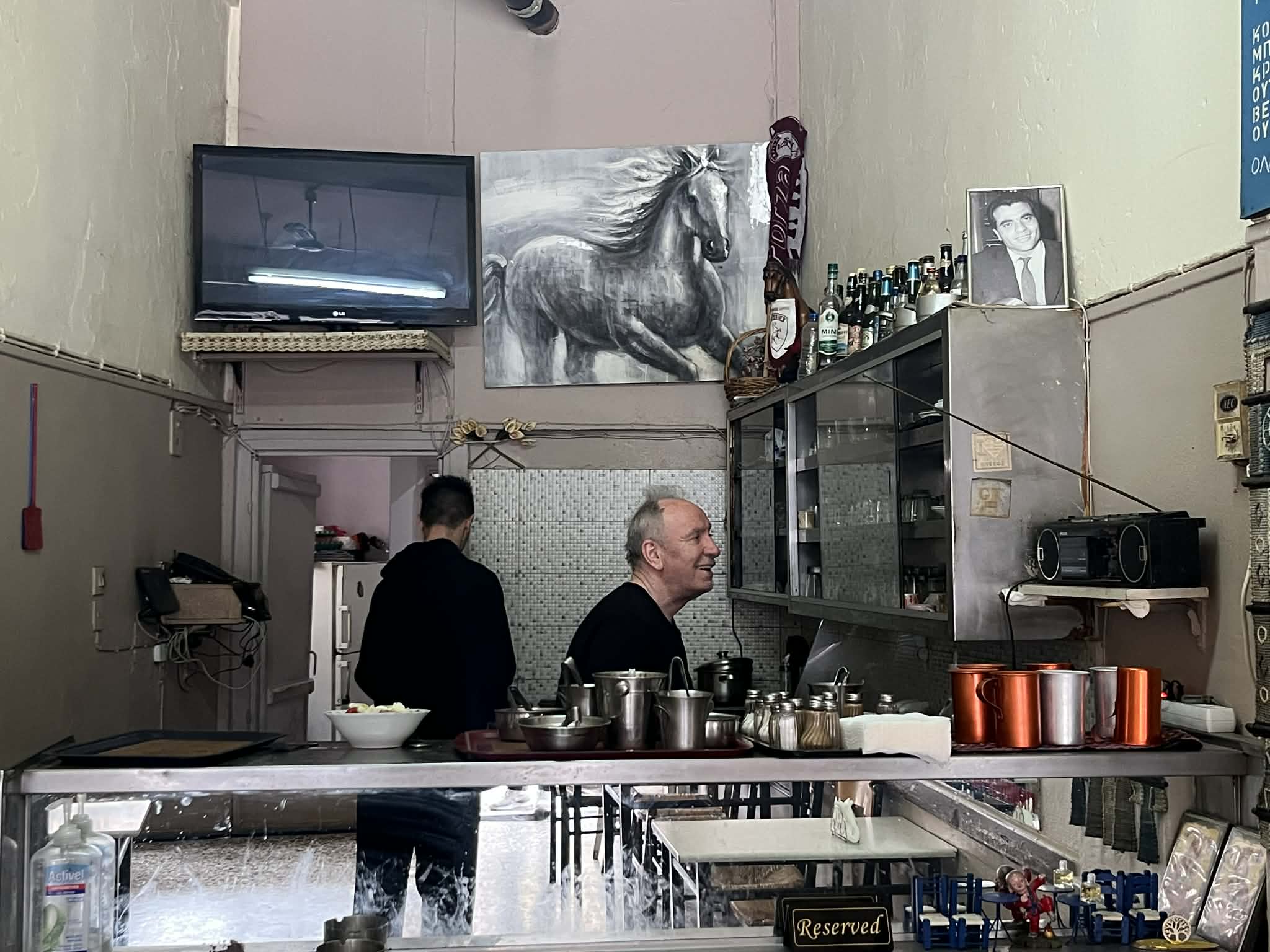 Αν σκεφτείς ότι τα πρώτα χρόνια – και για πολλά χρόνια – το μαγαζί άνοιγε τις 5:30 το πρωί σερβίροντας καφέδες και τραβούσε μέχρι μετά τα μεσάνυχτα, εκεί πέρασε όλη του τη ζωή. «Θα ΄ρθει ο Κατσαμπέλας να μας πάει από δω» μου λέει…