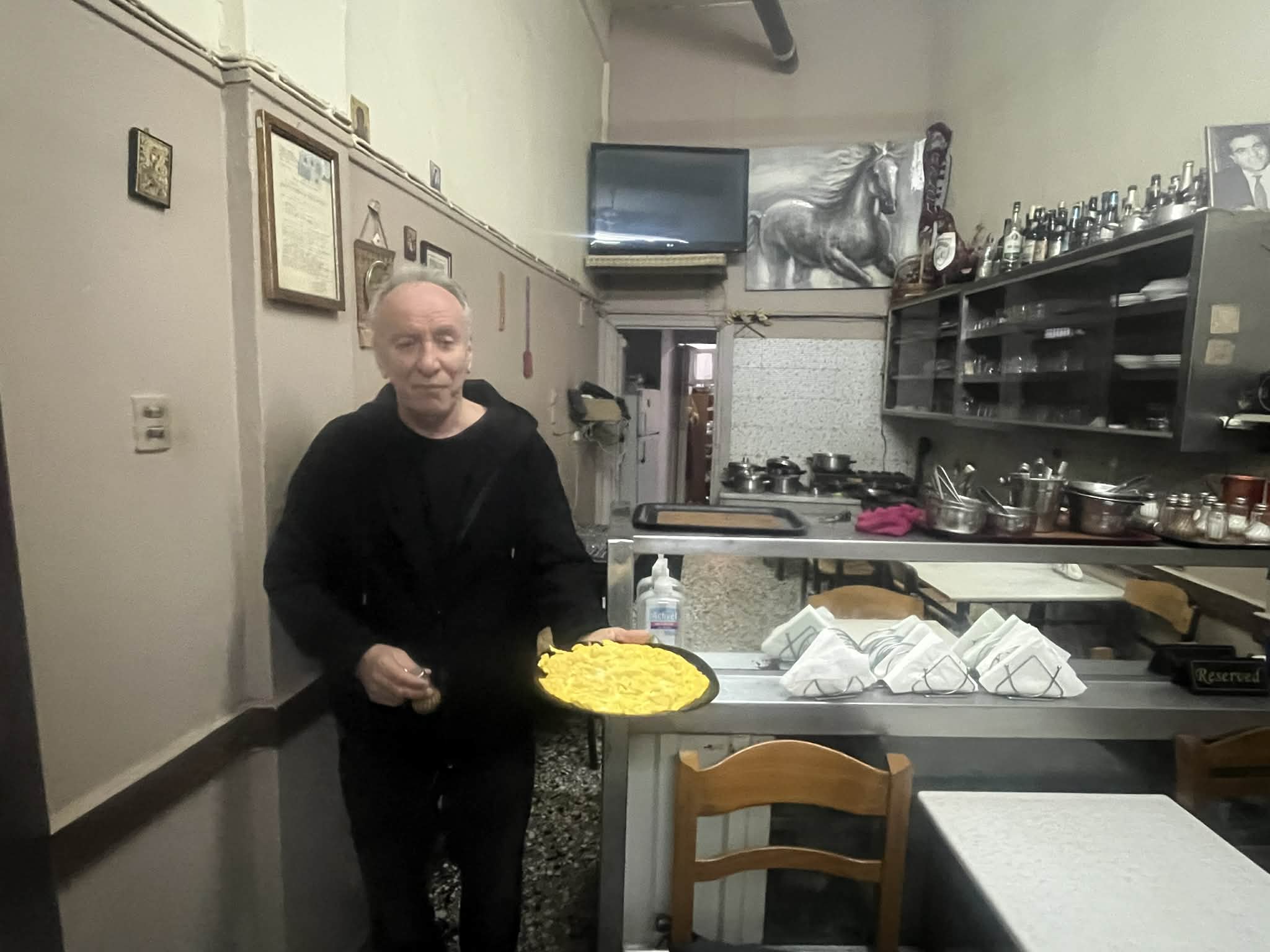 Αρχίζει να μου λέει μια ιστορία με έναν δικαστή, το πώς και οι δυο ξέρουν να «διαβάζουν» τους ανθρώπους…., αλλά εμφανίζεται κάποιος Γιάννης, γαμπρός στο Μελισσοχώρι. Κρατάει μια σακούλα με αυγά. «Επτά κότες σήμερα έκαναν οχτώ αυγά. Μόλις τα μάζεψα από τη φωλιά, είναι ζεστά ακόμη». Το τα δίνει για να του φτιάξει την περιβόητη ομελέτα. Με πατάτες μέσα. Και πίνει ένα διπλό ουίσκι…
