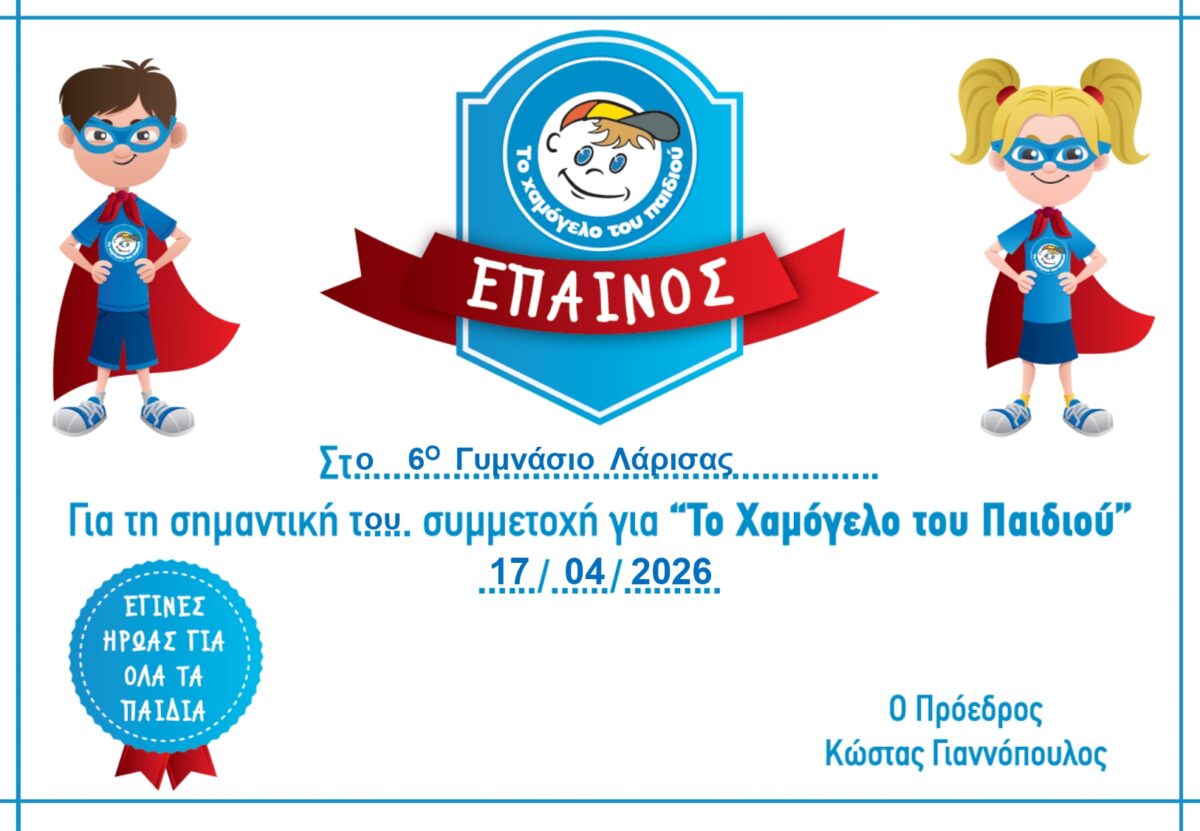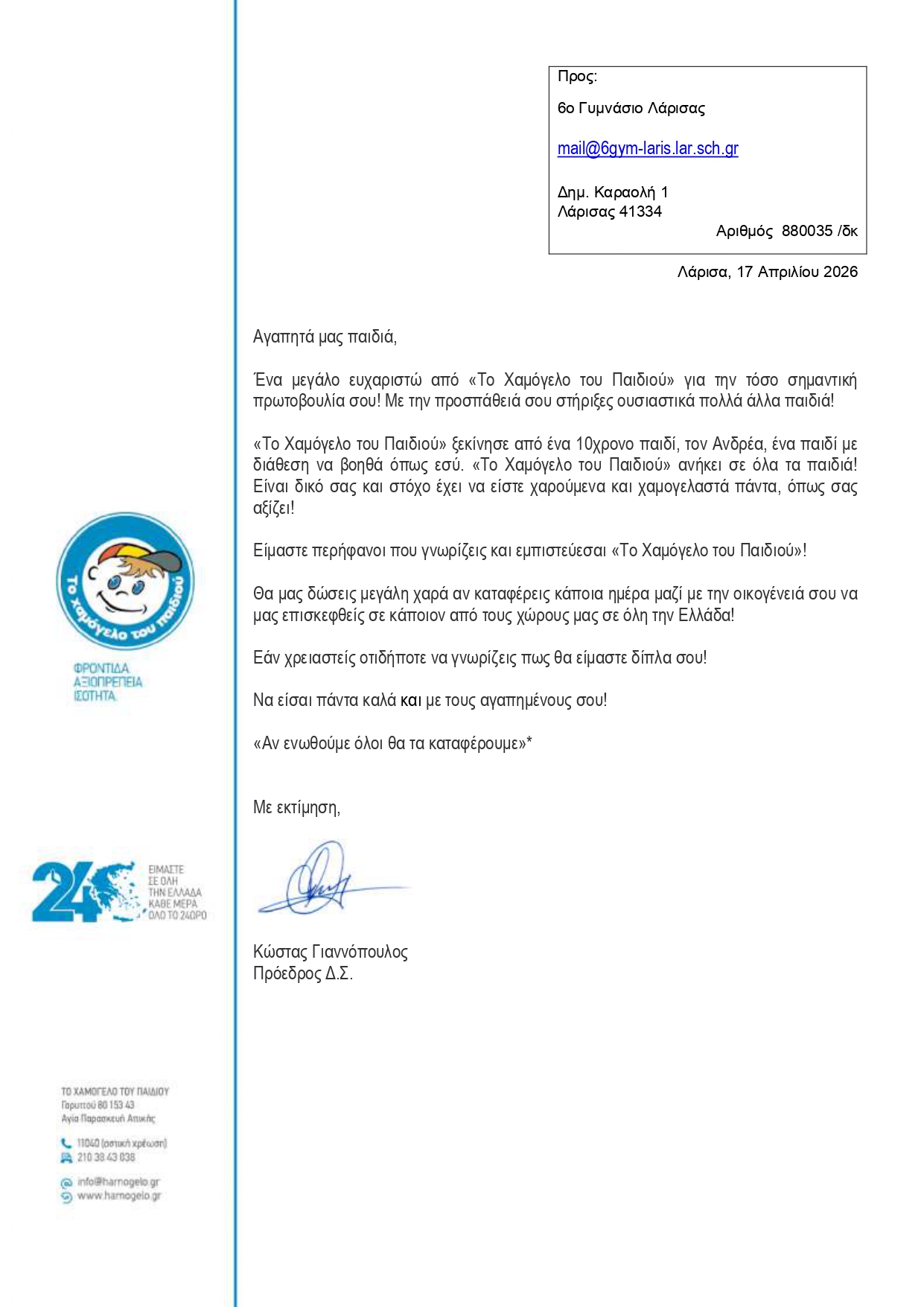 Με ιδιαίτερη χαρά και συγκίνηση, το 6ο Γυμνάσιο Λάρισας παρέλαβε την επίσημη ευχαριστήρια επιστολή και τον τιμητικό έπαινο από τον οργανισμό «Το Χαμόγελο του Παιδιού» για τη δράση συγκέντρωσης τροφίμων και ειδών πρώτης ανάγκης που πραγματοποιήσαμε ενόψει του Πάσχα.