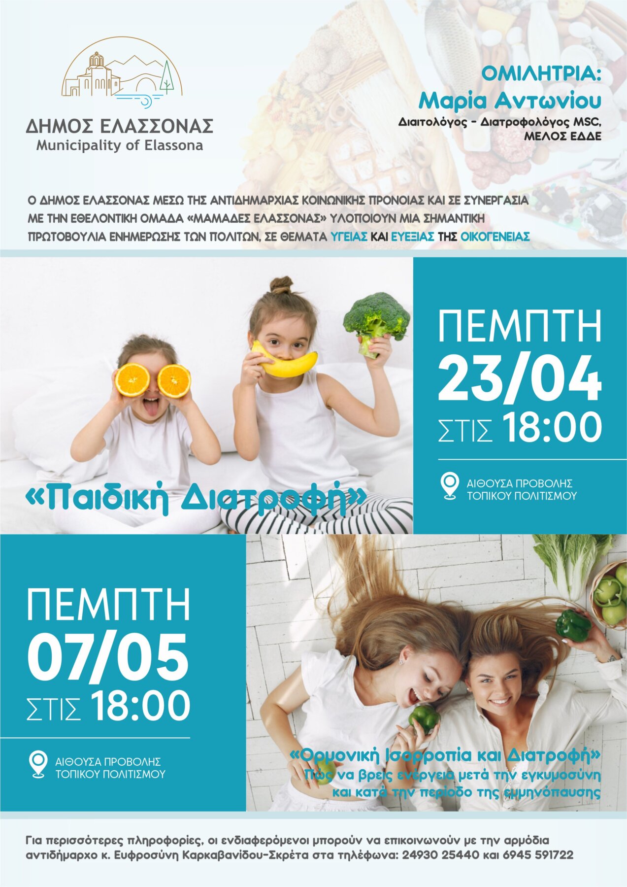 Μια σημαντική πρωτοβουλία ενημέρωσης και ευαισθητοποίησης των πολιτών σε θέματα διατροφής, υγείας και ευεξίας της οικογένειας υλοποιεί ο Δήμος Ελασσόνας, μέσω της Αντιδημαρχίας Κοινωνικής Πρόνοιας, σε συνεργασία με την εθελοντική ομάδα «Μαμάδες Ελασσόνας».