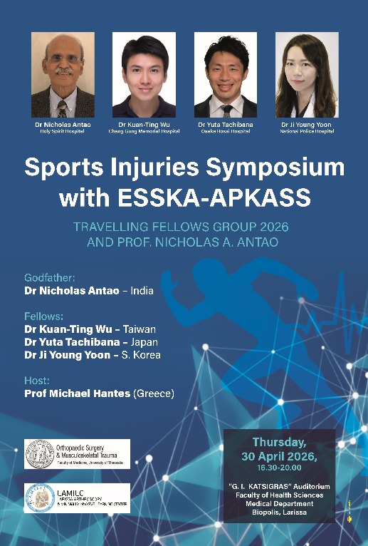Η Ευρωπαϊκή Εταιρεία Χειρουργικής Γόνατος, Αρθροσκόπησης και Aθλητικών Κακώσεων (ESSKA) και η αντίστοιχη επιστημονική Εταιρεία της Ασίας και του Ειρηνικού (APKASS) έχουν από 15ετίας αναγνωρίσει ως διαπιστευμένο Εκπαιδευτικό κέντρο την Ορθοπαιδική κλινική του Πανεπιστημιακού Νοσοκομείου της Λάρισας και, για 6η φορά, την έχουν επιλέξει ως σταθμό επίσκεψης μιας ομάδας Υποτρόφων Ορθοπαιδικών χειρουργών από την Ινδία, την Ταϊβάν, την Ιαπωνία και τη Ν. Κορέα, οι οποίοι θα φιλοξενηθούν στη Λάρισα από τις 29 Απριλίου μέχρι τις 2 Μαΐου 2026.