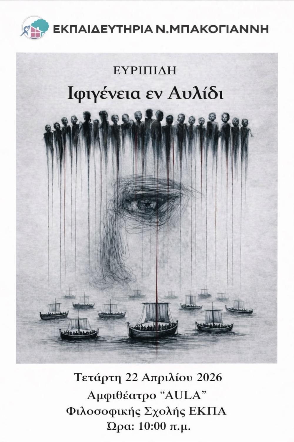 Η Θεατρική Οµάδα του Γυµνασίου των Εκπαιδευτηρίων Ν. Μπακογιάννη παρουσιάζει τηντραγωδία του Ευριπίδη «Ιφιγένεια εν Αυλίδι» αύριο Τετάρτη 22 Απριλίου στις 10 το πρωί, στο Αμφιθέατρο “AULA” της Φιλοσοφικής Σχολής του ΕΚΠΑ.