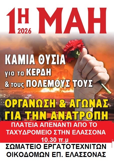 Σωματείο Οικοδόμων Ελασσόνας: «Όλοι στην απεργιακή συγκέντρωση της Πρωτομαγιάς στην πλατεία απέναντι από το ταχυδρομεί»